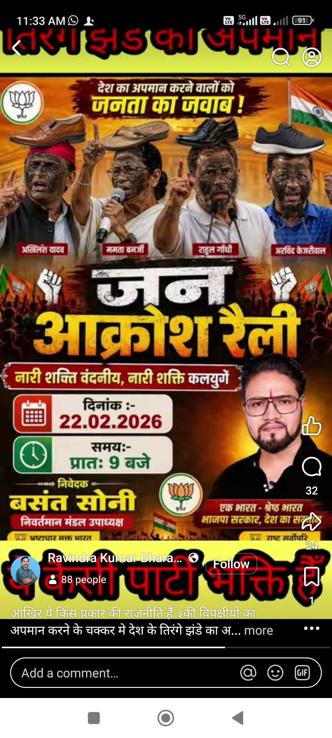सोशल मीडिया पर एक विवादित पोस्ट तेजी से वायरल हो रहा है, जिसे लेकर लोगों में भारी नाराज़गी देखी जा रही है। इस पोस्ट में देश के प्रमुख नेताओं की तस्वीरों के साथ आपत्तिजनक तरीके से जूते दर्शाए गए हैं, वहीं बैकग्राउंड में राष्ट्रीय ध्वज (तिरंगा) का भी इस्तेमाल किया गया है।