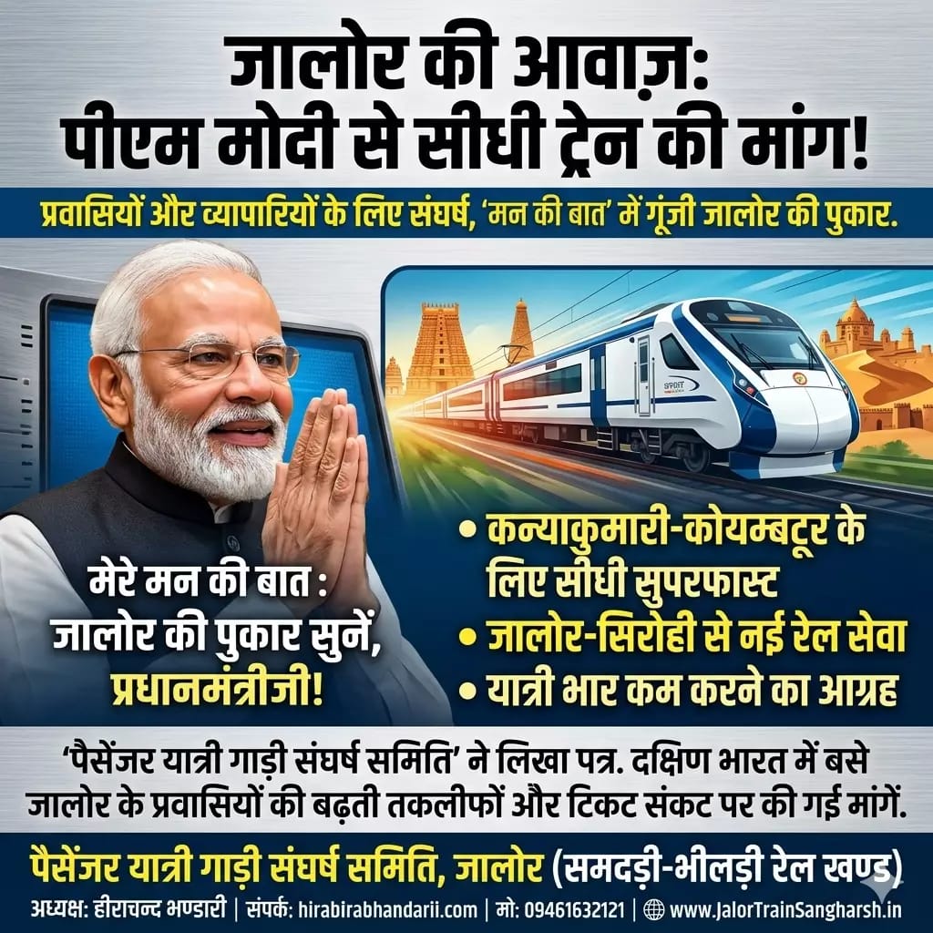 जालोर-सिरोही जिले की जनता द्वारा लगातार चार बार भाजपा को जनादेश देने के बावजूद रेल सुविधाओं के अभाव में स्थानीय लोगों और प्रवासियों को भारी दिक्कतों का सामना करना पड रहा है। पैसेंजर यात्री गाड़ी संघर्ष समिति, जालोर (समदडी-भीलडी रेल खण्ड) ने प्रधानमंत्री नरेन्द्र मोदी को “मेरे मन की बात” शीर्षक से पत्र लिखकर जिले की रेल समस्याओं के समाधान की गुहार लगाई है।