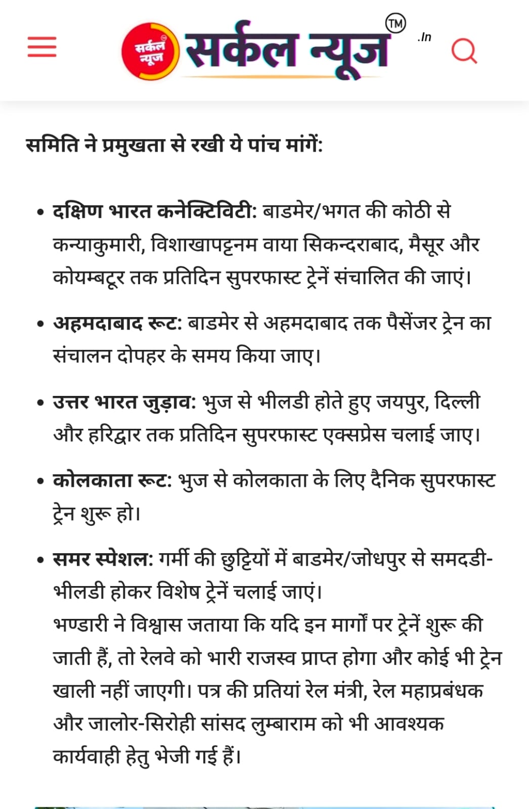 जालोर यात्री गाड़ी संघर्ष समिति ने दक्षिण भारत के लिए सीधी ट्रेन चलाने की मांग रखी