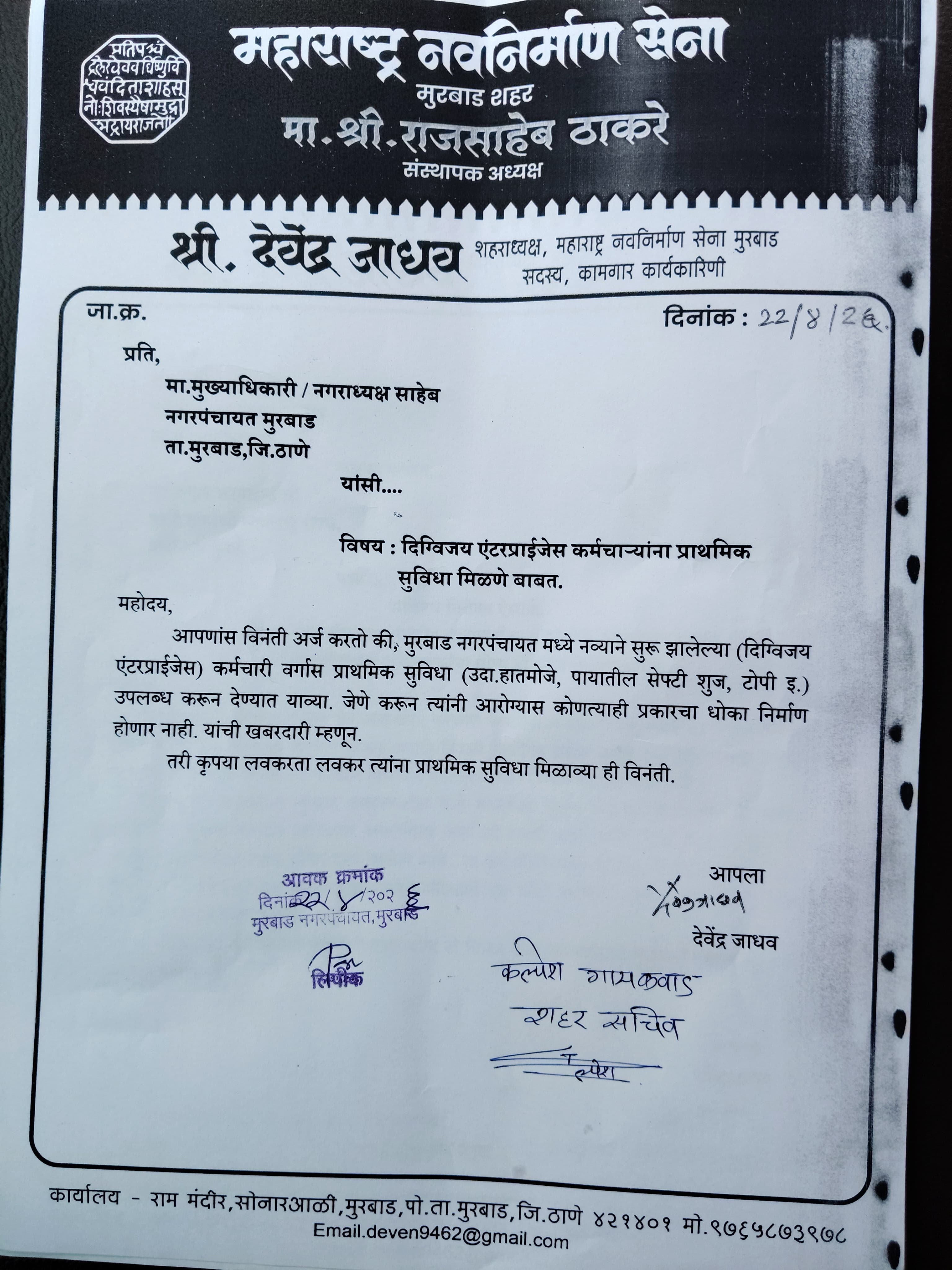 मुरबाड नगरपंचायतीमध्ये नव्याने सेवा सुरू केलेल्या दिग्विजय एंटरप्रायझेस च्या कामगारांना तातडीने प्राथमिक सुरक्षा साधने आणि सुविधा पुरवण्यात याव्यात, अशी मागणी महाराष्ट्र नवनिर्माण सेनेच्या वतीने करण्यात आली आहे. यासंदर्भात मनसेचे मुरबाड शहराध्यक्ष श्री. देवेंद्र जाधव यांनी नगरपंचायत प्रशासनाला लेखी निवेदन सादर केले आहे.