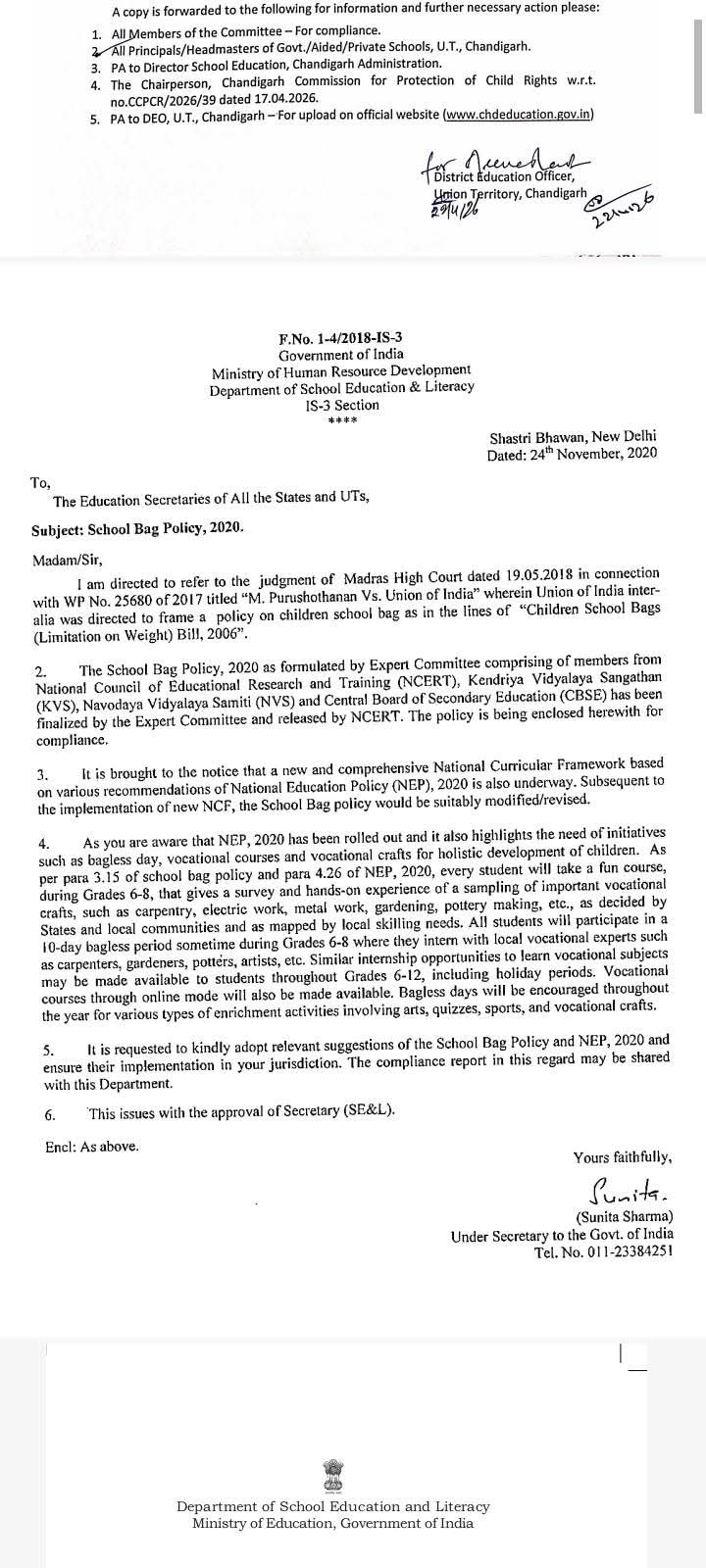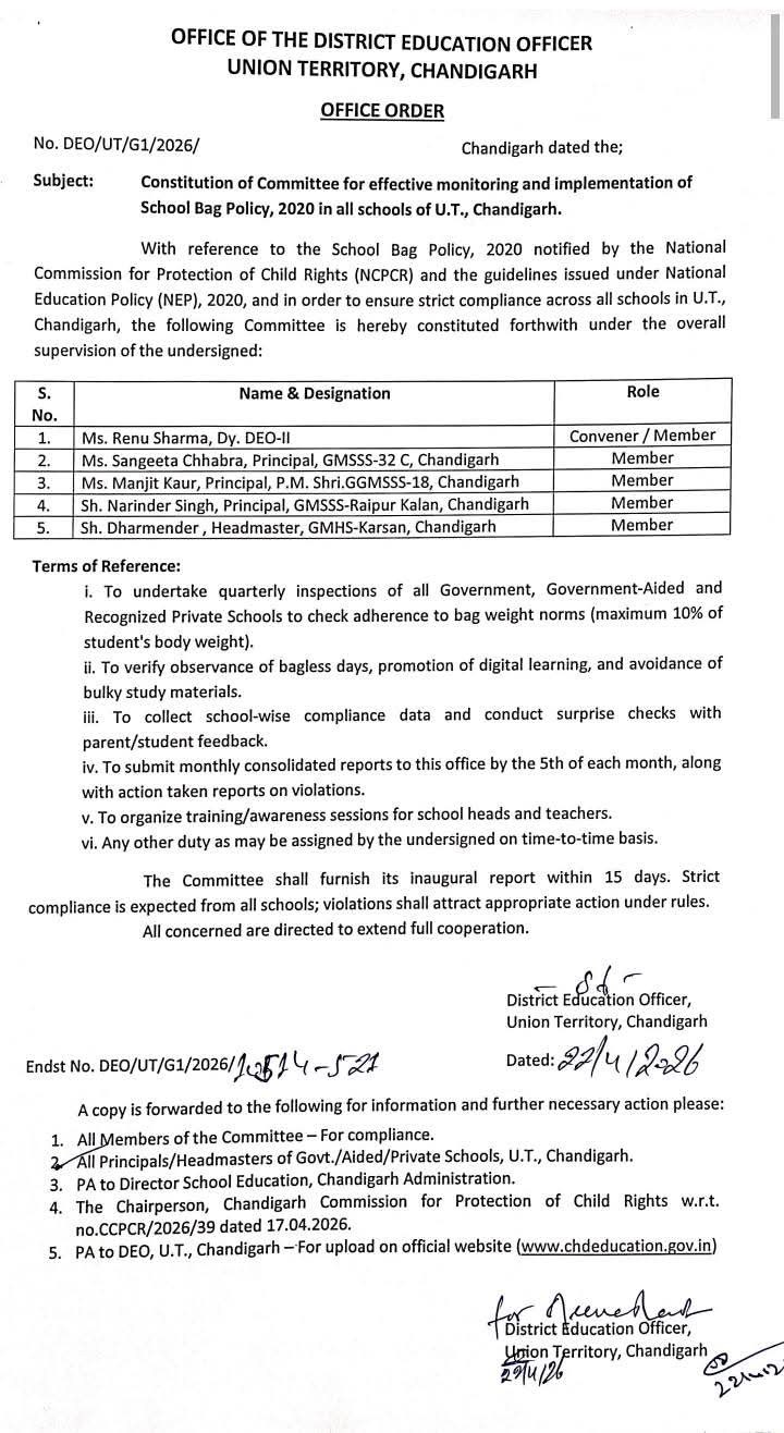 दो से चार किताब और चंद कॉपी, स्टेशनरी के साथ स्कूल आने वाले बच्चों के लिए good news ! UT CHANDIGARH SCHOOL