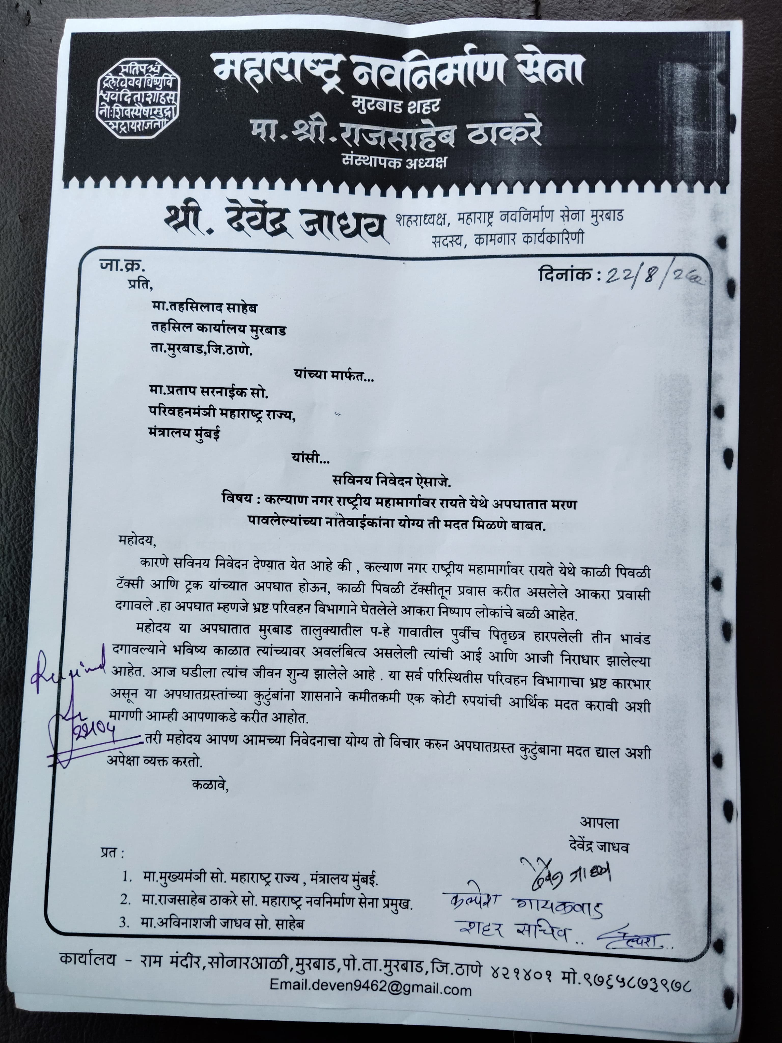 मुरबाड: कल्याण-नगर राष्ट्रीय महामार्गावर रायते येथे काळी-पिवळी टॅक्सी आणि ट्रक यांच्यात झालेल्या भीषण अपघातात ११ निष्पाप प्रवाशांचा मृत्यू झाला आहे. या हृदयद्रावक घटनेमुळे संपूर्ण मुरबाड तालुक्यावर शोककळा पसरली असून, अपघातग्रस्तांच्या कुटुंबांना तातडीने १ कोटी रुपयांची आर्थिक मदत मिळावी, अशी मागणी महाराष्ट्र नवनिर्माण सेनेचे मुरबाड शहराध्यक्ष देवेंद्र जाधव यांनी पत्राद्वारे केली आहे.