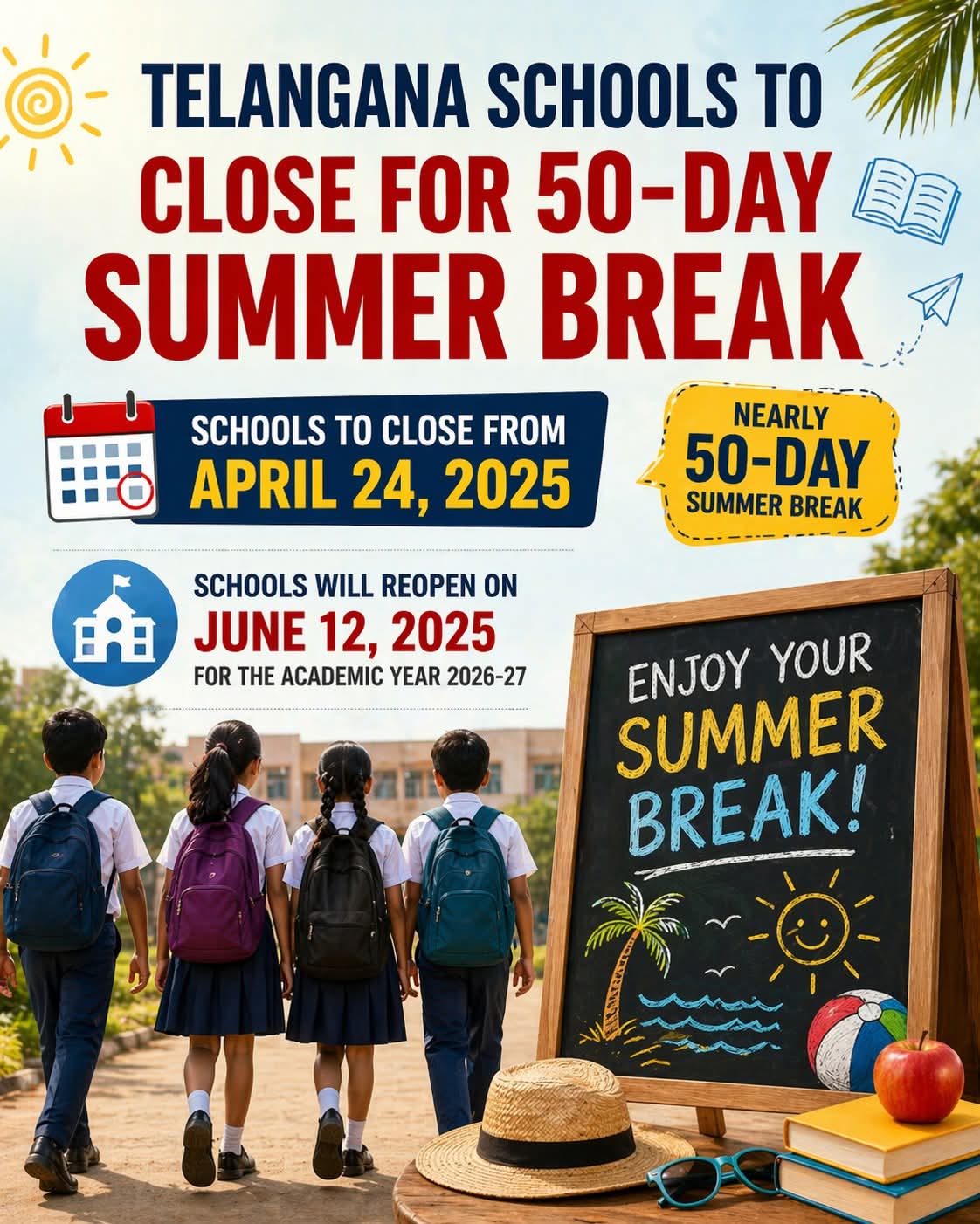 The 2025-26 academic year in the state of Telangana will conclude this Thursday, marking the beginning of approximately **50 days of summer vacation** starting from **April 24**. Schools are scheduled to reopen for the new 2026-27 academic year on **June 12**.