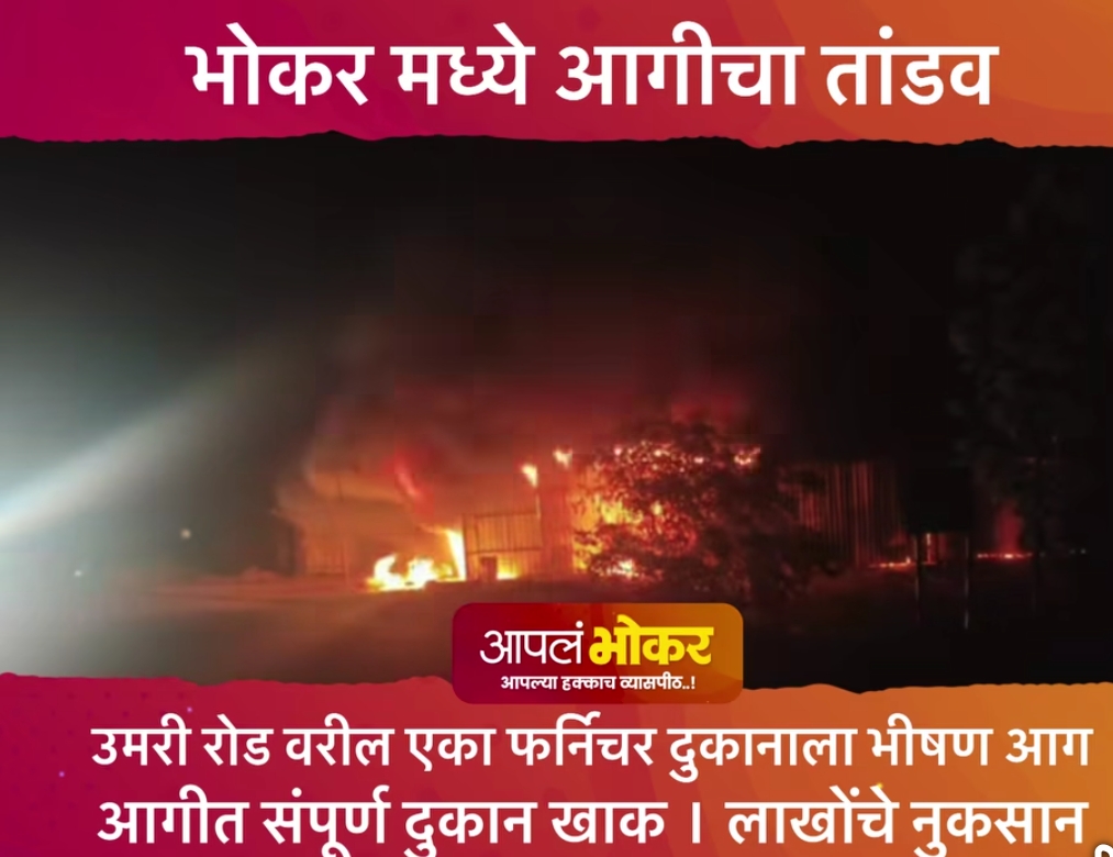 भोकर (जि. नांदेड): उमरी रोडवरील एका फर्निचरच्या दुकानाला भीषण आग लागल्याची खळबळजनक घटना घडली आहे. या आगीत दुकानातील फर्निचर आणि कच्चा माल जळून खाक झाला असून, व्यापाऱ्याचे लाखो रुपयांचे नुकसान झाले आहे.