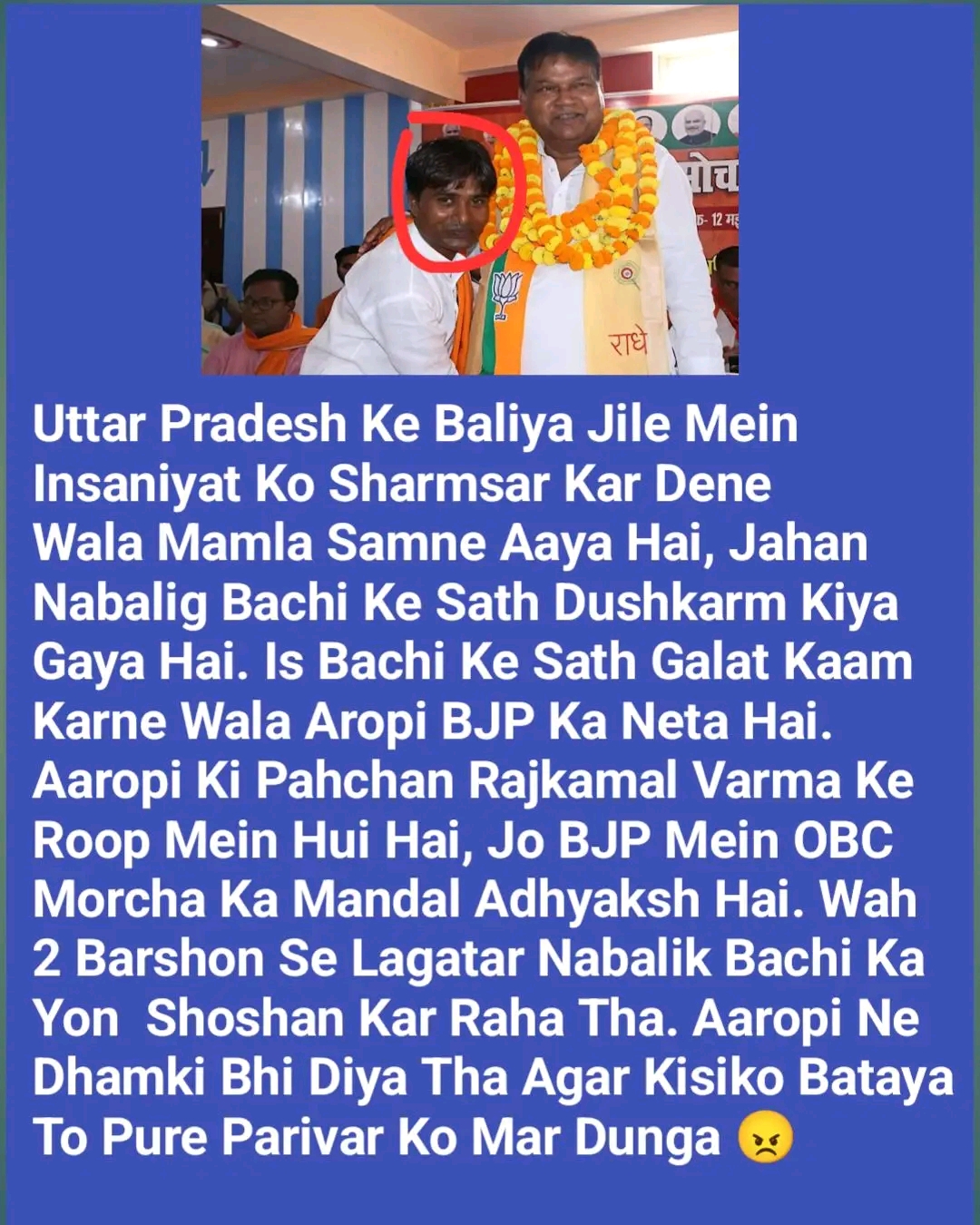 Jahan Nabalig Bachi Ke Sath Dushkarm Kiya Gaya Hai. Is Bachi Ke Sath Galat Kaam Karne Wala Aropi BJP Ka Neta Hai. Aaropi Ki Pahchan Rajkamal Varma Ke Roop Mein Hui Hai, Jo BJP Mein OBC Morcha Ka Mandal Adhyaksh Hai. Wah 2 Barshon Se Lagatar Nabalik Bachi Ka Yon Shoshan Kar Raha Tha. Aaropi Ne Dhamki Bhi Diya Tha Agar Kisiko Bataya To Pure Parivar Ko Mar Dunga 😠