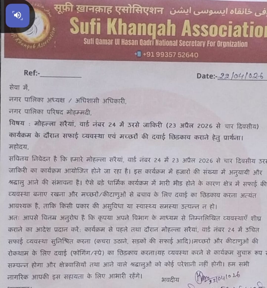 जिसे अब सीधे उच्चाधिकारियों और सार्वजनिक मंचों के माध्यम से हल करने की आवश्यकता है।चूंकि उर्स का कार्यक्रम कल 23 अप्रैल 2026 से शुरू हो रहा है जबकि फोन पे अधिशासी अधिकारी जगदेव प्रसाद मौर्या ने कहा एक पत्र हमको रिसीव करबा दीजिए पत्र रिसीव करबाने के करीब 18 घंटे होने के पश्चात कोई कार्रवाई नहीं हुई है, *प्रशासनिक उदासीनता पर एक नज़र* दावा बनाम हकीकत नगर पालिका अधिशासी अधिकारी ने आश्वासन तो दिया और पत्र भी प्राप्त कर लिया, लेकिन धरातल पर वार्ड नंबर 24 मोहल्ला सरैयां में गंदगी का अंबार लगा हुआ है।और मच्छरों का प्रकोप अधिशासी अधिकारी का फोन न उठाना उनकी कार्यशैली पर गंभीर प्रश्न चिह्न लगाता है, विशेषकर तब जब हजारों श्रद्धालुओं की स्वास्थ्य सुरक्षा दांव पर है। नगर पालिका परिषद मोहम्मदी के अधिशासी अधिकारी जगदेव प्रसाद मौर्य संदर्भानुसार की जिम्मेदारी है कि वे जनहित के कार्यों को प्राथमिकता दें यदि समय रहते फॉगिंग और सफाई नहीं होती है, तो सूफी खानकाह एसोसिएशन राष्ट्रीय सचिव सूफी कमरुल हसन कादरी एवं पदाधिकारी कार्यकर्ता स्थानीय निवासी नगर पालिका कार्यालय का घेराव करना ही अंतिम विकल्प बचता है *एम एच रज़ा वाहिदी राष्ट्रीय मीडिया सलाहकार सूफी खानकाह एसोसिएशन✍️*