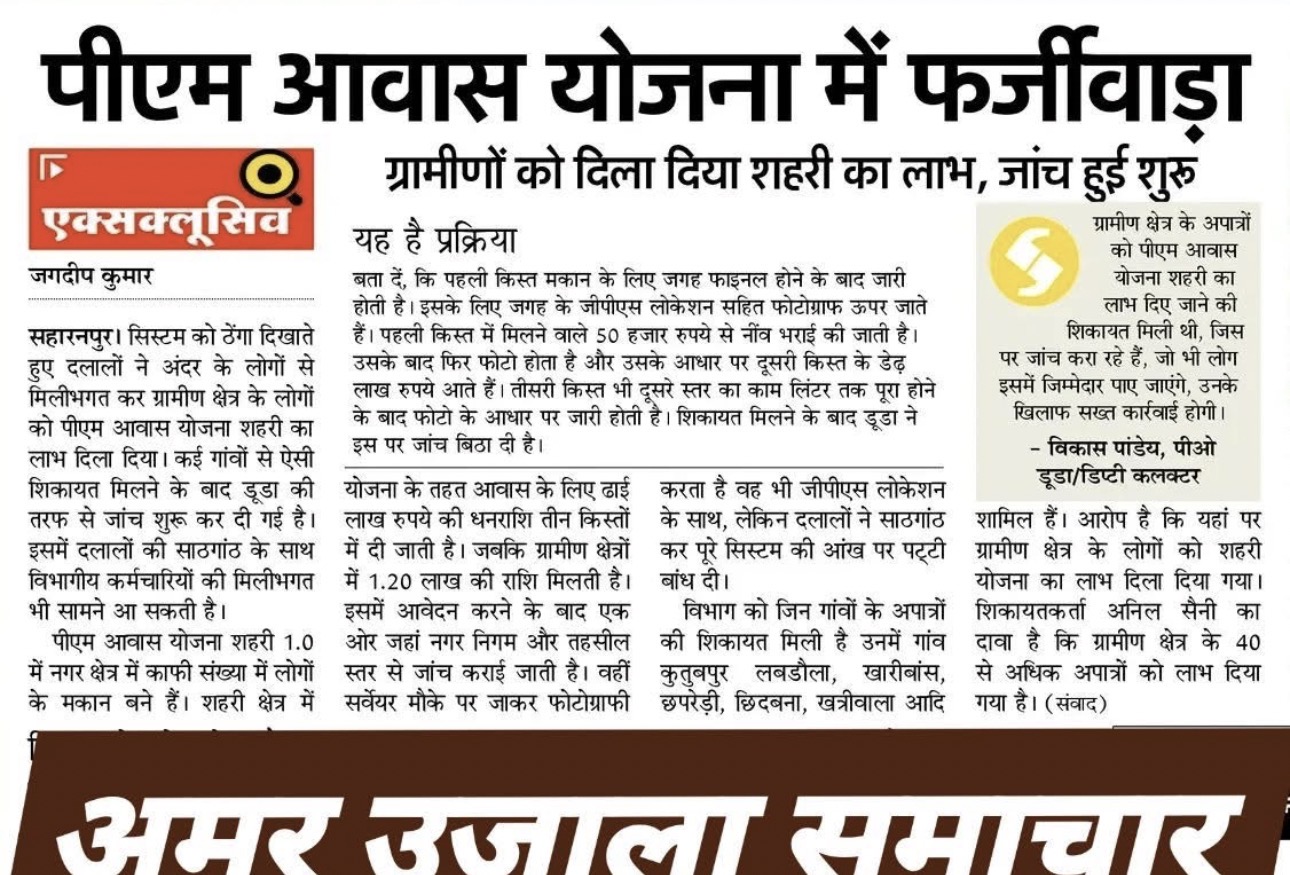 सहारनपुर में पीएम आवास योजना (शहरी) में बड़े फर्जीवाड़े का खुलासा हुआ है ।