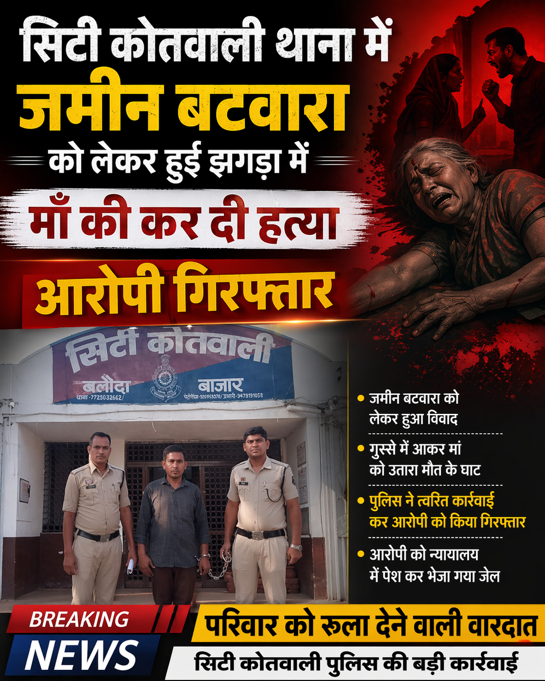 घटना की सूचना मिलते ही सिटी कोतवाली पुलिस हरकत में आई और त्वरित कार्रवाई करते हुए आरोपी को गिरफ्तार कर लिया। मामले में अपराध क्रमांक 334/2026 धारा 103(1) बीएनएस के तहत प्रकरण दर्ज कर जांच की जा रही है। आरोपी धनेश्वर वर्मा (42 वर्ष), निवासी ग्राम मगरवाय को न्यायालय में पेश करने की प्रक्रिया जारी है।