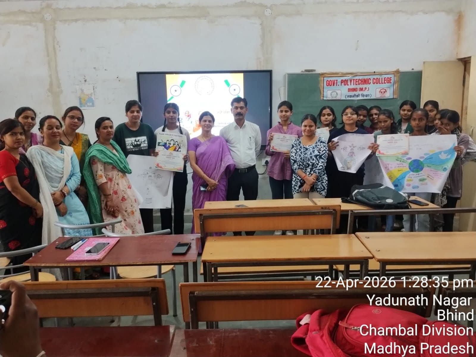 आज शासकीय पॉलिटेक्निक महाविद्यालय भिण्ड में "नारी शक्ति वंदन" पखवाड़े पर व्याख्यान/संगोष्ठी का आयोजन सफलतापूर्वक संपन्न हुआ। इस कार्यक्रम में श्रीमती रूपल पुरोहित (प्रभारी सिविल/नोडल अधिकारी), श्री आशीष शर्मा (वरिष्ठ व्याख्याता), श्रीमती प्राची बाजपेयी, श्रीमती हेमलता परिहार, श्रीमती साधना शर्मा, श्रीमती प्रियंका चौहान, श्रीमती किरण नरवरिया, श्रीमती प्रियंका पचौरी, श्रीमती रितु परिहार तथा समस्त फैकेल्टी एवं विद्यार्थियों की गरिमामयी उपस्थिति रही।