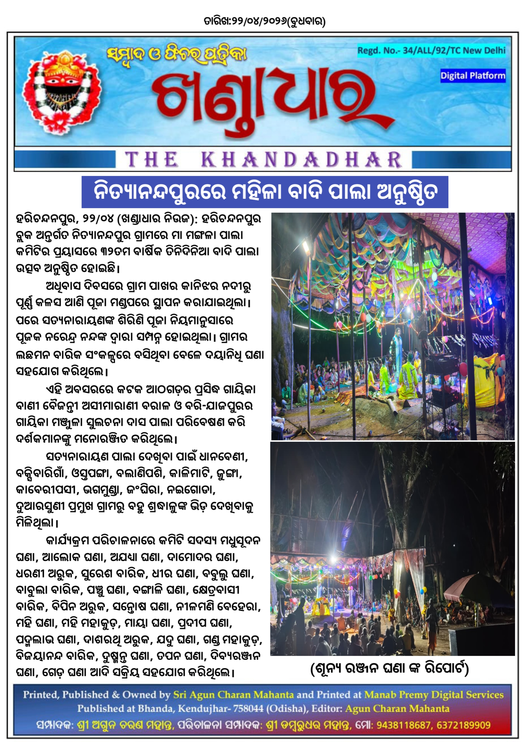 ହରିଚନ୍ଦନପୁର, ୨୨/୦୪ (ଶୂନ୍ୟରଞ୍ଜନ ଘଣା): ହରିଚନ୍ଦନପୁର ବ୍ଲକ ଅନ୍ତର୍ଗତ ନିତ୍ୟାନନ୍ଦପୁର ଗ୍ରାମରେ ମା ମଙ୍ଗଳା ପାଲା କମିଟିର ପ୍ରୟାସରେ ୩୨ତମ ବାର୍ଷିକ ତିନିଦିନିଆ ବାଦି ପାଲା ଉତ୍ସବ ଅନୁଷ୍ଠିତ ହୋଇଛି।