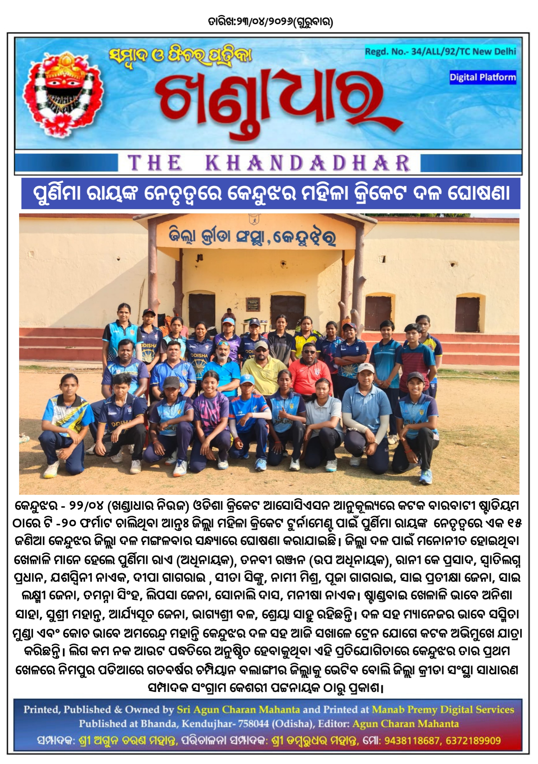 କେନ୍ଦୁଝର - ୨୨/୦୪ (ଖଣ୍ଡାଧାର ନିଉଜ) ଓଡିଶା କ୍ରିକେଟ ଆସୋସିଏସନ ଆନୁକୂଲ୍ୟରେ କଟକ ବାରବାଟୀ ଷ୍ଟାଡିୟମ ଠାରେ ଟି -୨୦ ଫର୍ମାଟ ଚାଲିଥିବା ଆନ୍ତଃ ଜିଲ୍ଲା ମହିଳା କ୍ରିକେଟ ଟୁର୍ନାମେଣ୍ଟ ପାଇଁ ପୁର୍ଣିମା ରାୟଙ୍କ ନେତୃତ୍ୱରେ ଏକ ୧୫ ଜଣିଆ କେନ୍ଦୁଝର ଜିଲ୍ଲା ଦଳ ମଙ୍ଗଳବାର ସନ୍ଧ୍ୟାରେ ଘୋଷଣା କରାଯାଇଛି l ଜିଲ୍ଲା ଦଳ ପାଇଁ ମନୋନୀତ ହୋଇଥିବା ଖେଳାଳି ମାନେ ହେଲେ ପୁର୍ଣିମା ରାଏ (ଅଧିନାୟକ ), ତନବୀ ରଞ୍ଜନ (ଉପ ଅଧିନାୟକ ), ରାନୀ କେ ପ୍ରସାଦ, ସ୍ଵାତିଲଗ୍ନ ପ୍ରଧାନ, ଯଶସ୍ୱିନୀ ନାଏକ, ଦୀପା ଗାଗରାଇ , ସୀତା ସିଙ୍କୁ, ନାମୀ ମିଶ୍ର, ପୂଜା ଗାଗରାଇ, ସାଇ ପ୍ରତୀକ୍ଷା ଜେନା, ସାଇ ଲକ୍ଷ୍ମୀ ଜେନା, ତମନ୍ନା ସିଂହ, ଲିପସା ଜେନା, ସୋନାଲି ଦାସ, ମନୀଷା ନାଏକ l ଷ୍ଟାଣ୍ଡବାଇ ଖେଳାଳି ଭାବେ ଅନିଶା ସାହା, ସୁଶ୍ରୀ ମହାନ୍ତ, ଆର୍ଯ୍ୟସୂତ ଜେନା, ଭାଗ୍ୟଶ୍ରୀ ବଳ, ଶ୍ରେୟା ସାହୁ ରହିଛନ୍ତି l ଦଳ ସହ ମ୍ୟାନେଜର ଭାବେ ସସ୍ମିତା ମୁଣ୍ଡା ଏବଂ କୋଚ ଭାବେ ଅମରେନ୍ଦ୍ର ମହାନ୍ତି କେନ୍ଦୁଝର ଦଳ ସହ ଆଜି ସଖାଳେ ଟ୍ରେନ ଯୋଗେ କଟକ ଅଭିମୁଖେ ଯାତ୍ରା କରିଛନ୍ତି l ଲିଗ କମ ନକ ଆଉଟ ପଦ୍ଧତିରେ ଅନୁଷ୍ଠିତ ହେବାକୁଥିବା ଏହି ପ୍ରତିଯୋଗିତାରେ କେନ୍ଦୁଝର ତାର ପ୍ରଥମ ଖେଳରେ ନିମପୁର ପଡିଆରେ ଗତବର୍ଷର ଚମ୍ପିୟାନ ବଲାଙ୍ଗୀର ଜିଲ୍ଲାକୁ ଭେଟିବ ବୋଲି ଜିଲ୍ଲା କ୍ରୀଡା ସଂସ୍ଥା ସାଧାରଣ ସମ୍ପାଦକ ସଂଗ୍ରାମ କେଶରୀ ପଟ୍ଟନାୟକ ଠାରୁ ପ୍ରକାଶ l