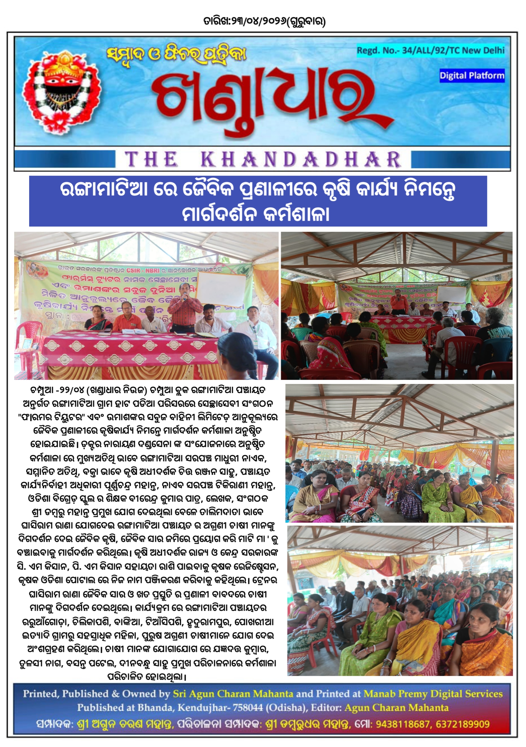ଚମ୍ପୁଆ -୨୨/୦୪(ଖଣ୍ଡାଧାର ନିଉଜ) ଚମ୍ପୁଆ ବ୍ଲକ ରଙ୍ଗାମାଟିଆ ପଞ୍ଚାୟତ ଅନ୍ତର୍ଗତ ରଙ୍ଗାମାଟିଆ ଗ୍ରାମ ହାଟ ପଡିଆ ପରିସରରେ ସେଚ୍ଛାସେବୀ ସଂଗଠନ "ଫlରମର ଟିୟୁଟର " ଏବଂ ଉମାଶଙ୍କର ସବୁଜ ବାହିନୀ ଲିମିଟେଡ଼ ଆନୁକୂଲ୍ୟରେ ଜୈବିକ ପ୍ରଣାଳୀରେ କୃଷିକାର୍ଯ୍ୟ ନିମନ୍ତେ ମାର୍ଗଦର୍ଶନ କର୍ମଶାଳା ଅନୁଷ୍ଠିତ ହୋଇଯାଇଛି l ଡ଼କ୍ଟର ନାରାୟଣ ଦଣ୍ଡସେନା ଙ୍କ ସଂଯୋଜନାରେ ଅନୁଷ୍ଠିତ କର୍ମଶାଳା ରେ ମୁଖ୍ୟଅତିଥି ଭାବେ ରଙ୍ଗାମାଟିଆ ସରପଞ୍ଚ ମାଧୁରୀ ନାଏକ, ସମ୍ମାନିତ ଅତିଥି, ବକ୍ତା ଭାବେ କୃଷି ଅଧୀଦର୍ଶକ ଚିତ୍ତ ରଞ୍ଜନ ସାହୁ, ପଞ୍ଚାୟତ କାର୍ଯ୍ୟନିର୍ବାହୀ ଅଧିକାରୀ ପୂର୍ଣ୍ଣଚନ୍ଦ୍ର ମହାନ୍ତ, ନାଏବ ସରପଞ୍ଚ ଟିକିରାଣୀ ମହାନ୍ତ, ଓଡିଶା ବିଗ୍ରେଡ଼ ସ୍କୁଲ ର ଶିକ୍ଷକ ବୀରେନ୍ଦ୍ର କୁମାର ପାତ୍ର, ଲେଖକ, ସଂଗଠକ ଶ୍ରୀ ଡମ୍ବରୁ ମହାନ୍ତ ପ୍ରମୁଖ ଯୋଗ ଦେଇଥିଲା ବେଳେ ତାଲିମଦାତା ଭାବେ ଘାସିରାମ ରାଣା ଯୋଗଦେଇ ରଙ୍ଗାମାଟିଆ ପଞ୍ଚାୟତ ର ଅଗ୍ରଣୀ ଚାଷୀ ମାନଙ୍କୁ ଦିଗଦର୍ଶନ ଦେଇ ଜୈବିକ କୃଷି, ଜୈବିକ ସାର ଜମିରେ ପ୍ରୟୋଗ କରି ମାଟି ମା ' କୁ ବଞ୍ଚାଇବାକୁ ମାର୍ଗଦର୍ଶନ କରିଥିଲେ l କୃଷି ଅଧୀଦର୍ଶକ ରାଜ୍ୟ ଓ କେନ୍ଦ୍ର ସରକାରଙ୍କ ସି. ଏମ କିସାନ, ପି. ଏମ କିସାନ ସହାୟତା ରାଶି ପାଇବାକୁ କୃଷକ ରେଜିଷ୍ଟେସନ, କୃଷକ ଓଡିଶା ପୋଟାଲ ରେ ନିଜ ନାମ ପଞ୍ଜିକରଣ କରିବାକୁ କହିଥିଲେ l ଟ୍ରେନର ଘାସିରାମ ରାଣା ଜୈବିକ ସାର ଓ ଖତ ପ୍ରସ୍ତୁତି ର ପ୍ରଣାଳୀ ବାବଦରେ ଚାଷୀ ମାନଙ୍କୁ ଦିଗଦର୍ଶନ ଦେଇଥିଲେ l କାର୍ଯ୍ୟକ୍ରମ ରେ ରଙ୍ଗାମାଟିଆ ପଞ୍ଚାୟତର ରରୁଆଁଗୋଡ଼ା, ଚିଲିକାପଶି, ବାଙ୍କିଆ, ଟିଆଁସିପଶି, ହୃଦୁରାମପୁର, ପୋଖରୀଆ ଇତ୍ୟାଦି ଗ୍ରାମରୁ ସହସ୍ରାଧିକ ମହିଳା, ପୁରୁଷ ଅଗ୍ରଣୀ ଚାଷୀମାନେ ଯୋଗ ଦେଇ ଅଂଶଗ୍ରହଣ କରିଥିଲେ l ଚାଷୀ ମାନଙ୍କ ଯୋଗାଯୋଗ ରେ ଯଜ୍ଞଦତ୍ତ କୁମ୍ବାର, ତୁଳସୀ ନାଗ, ବସନ୍ତ ପଟେଲ, ଦୀନବନ୍ଧୁ ସାହୁ ପ୍ରମୁଖ ପରିଚାଳନାରେ କର୍ମଶାଳା ପରିଚାଳିତ ହୋଇଥିଲା l