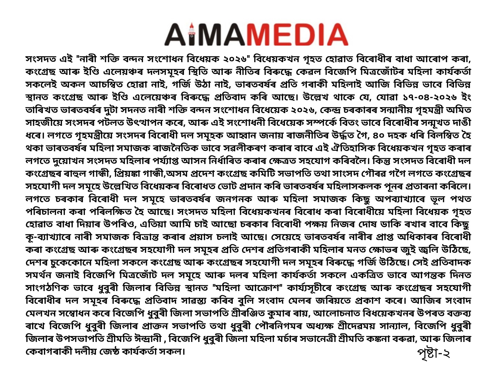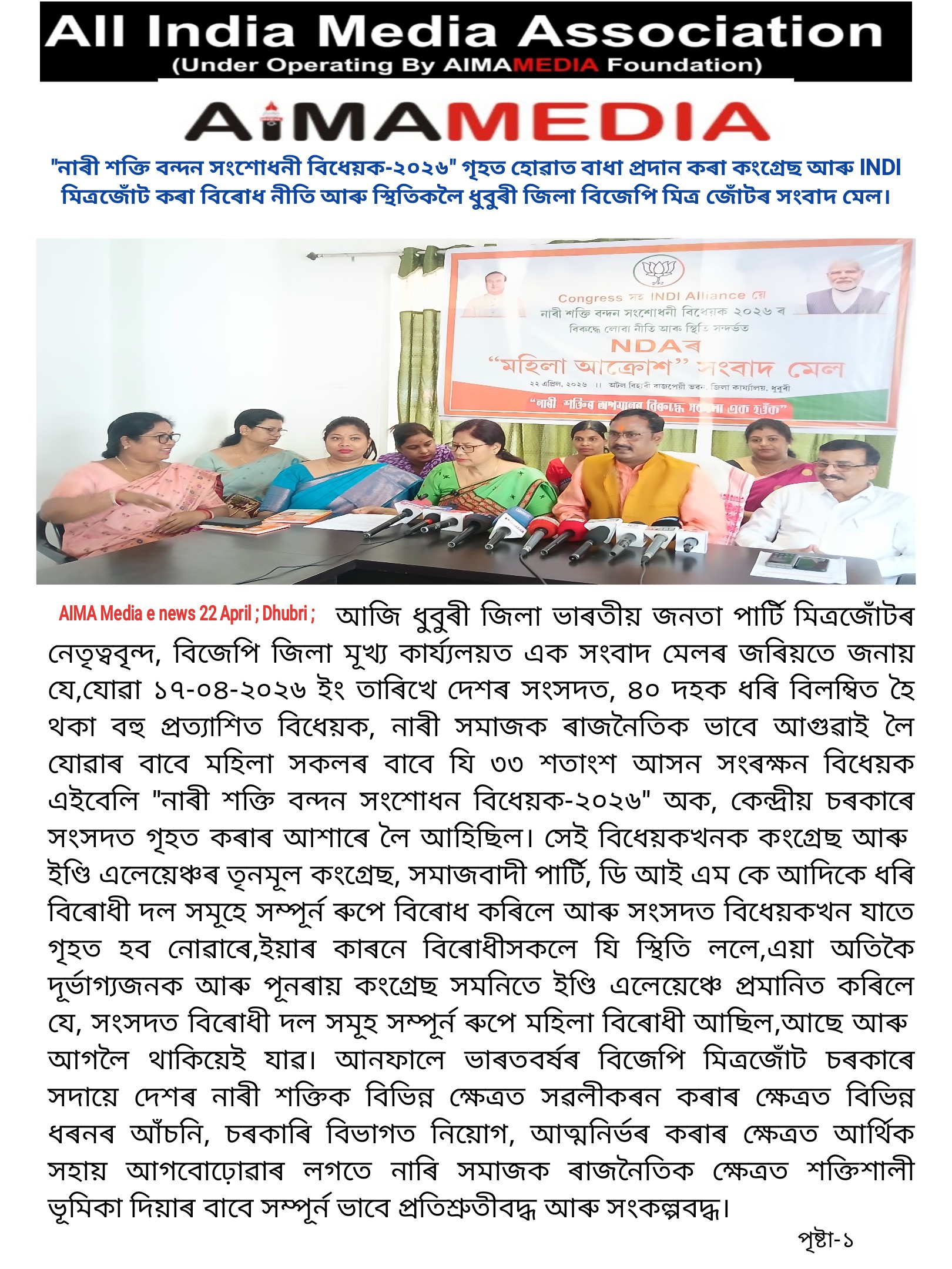 "নাৰী শক্তি বন্দন সংশোধনী বিধেয়ক-২০২৬" গৃহত নোহোৱাত বিজেপি মিত্ৰজোঁটৰ মহিলা সকলৰ ক্ষোভ আৰু সংবাদ মেল