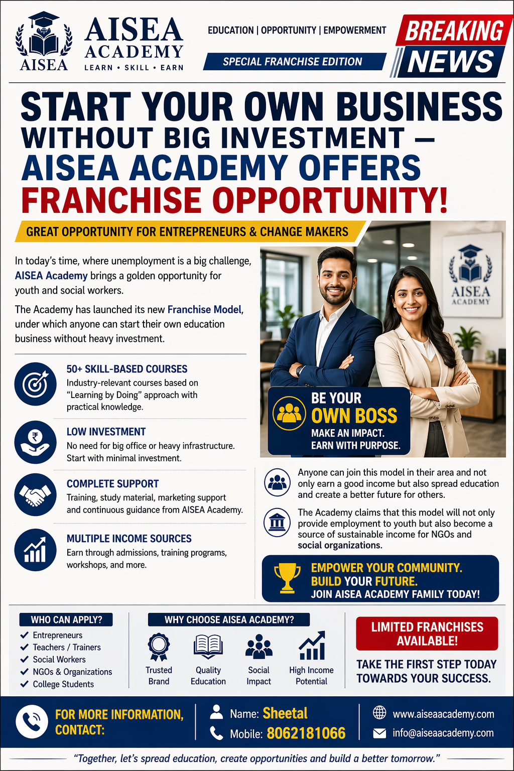 आज के समय में जहां बेरोजगारी एक बड़ी चुनौती बनी हुई है, वहीं AISEA Academy युवाओं और सामाजिक कार्यकर्ताओं के लिए एक सुनहरा अवसर लेकर आई है। Academy ने अपना नया Franchise Model लॉन्च किया है, जिसके तहत कोई भी व्यक्ति बिना बड़े निवेश के अपना खुद का एजुकेशन बिज़नेस शुरू कर सकता है।