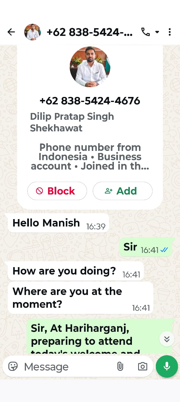 जानकारी मिली है कि उक्त फर्जी प्रोफाइल के माध्यम से कुछ पदाधिकारियों एवं आम नागरिकों को व्हाट्सएप संदेश भेजे जा रहे हैं।
