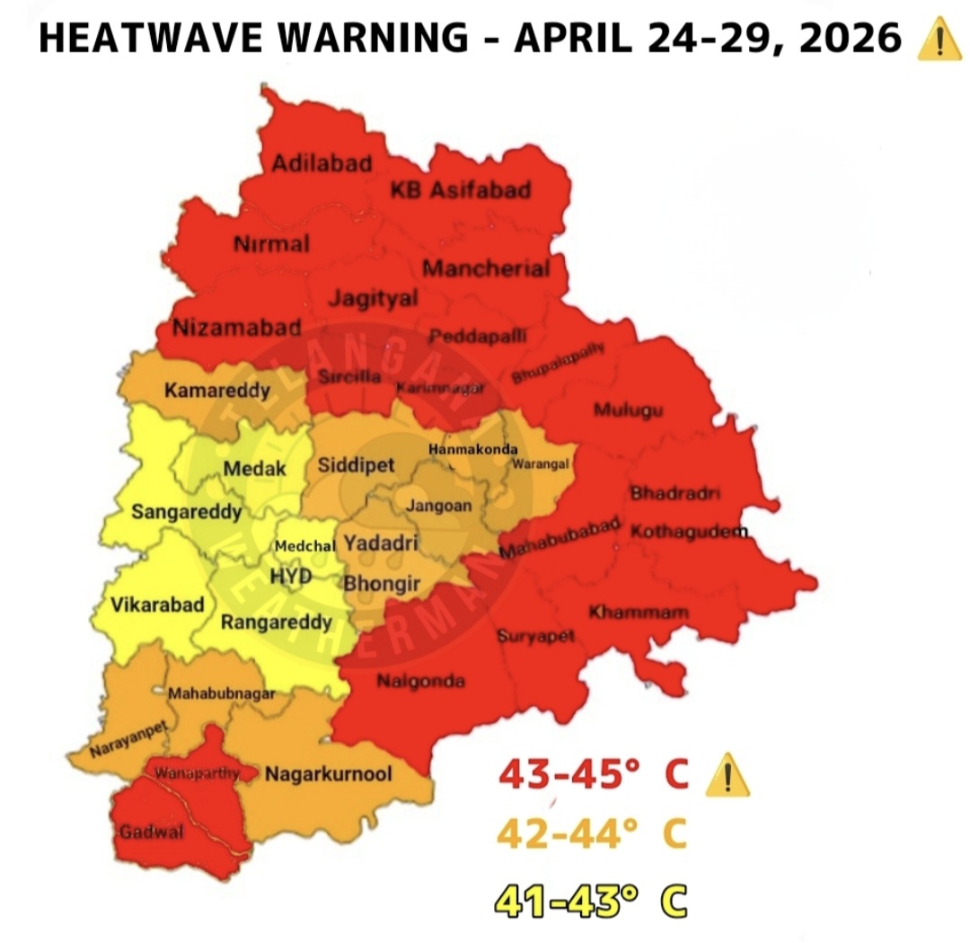 Dear people of Telangana, get ready for SEVERE HEATWAVE 2.0 from tomorrow with temperatures to touch 45°C in RED MARKED districts during April 24-29 ⚠️