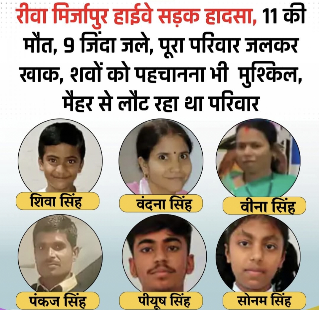 रीवा मिर्जापुर नेशनल हाईवे के डायमंडगंज घाट में बुधवार रात हुए भीषण सड़क हादसे ने हर किसी को स्तब्ध कर दिया। मिर्जापुर-रीवा नेशनल हाईवे पर रात करीब 9:30 बजे एक तेज रफ्तार ट्रक के ब्रेक फेल होने से यह दर्दनाक हादसा हुआ। बेकाबू ट्रक ने पहले बोलेरो और स्विफ्ट कार को टक्कर मारी, जिसके बाद दोनों गाड़ियां आगे चल रहे ट्रॉले से जा भिड़ीं। टक्कर इतनी जबरदस्त थी कि बोलेरो उछलकर अलग जा गिरी और उसमें आग लग गई। कुछ ही पलों में आग ने पूरी गाड़ी को घेर लिया और उसमें सवार 9 लोग जिंदा जल गए।