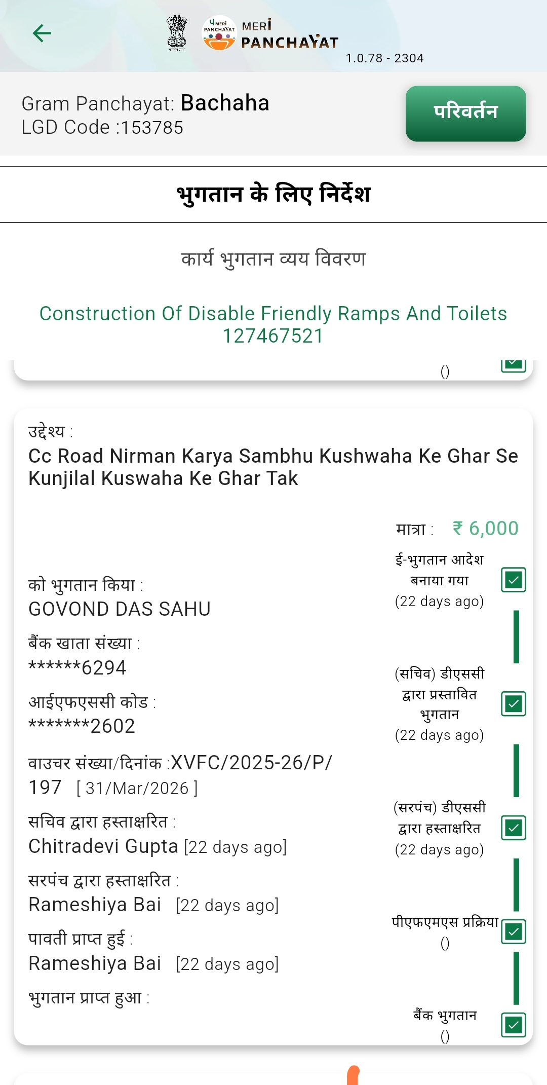 ग्राम पंचायत बचाहा में सरपंच द्वारा अपने ही भाई लड़के बहु के सफाई के नाम पर लगभग 45 हजार से ज्यादा का घोटाला फर्जी वेंडर बना के पैसे आहरण किए गए है