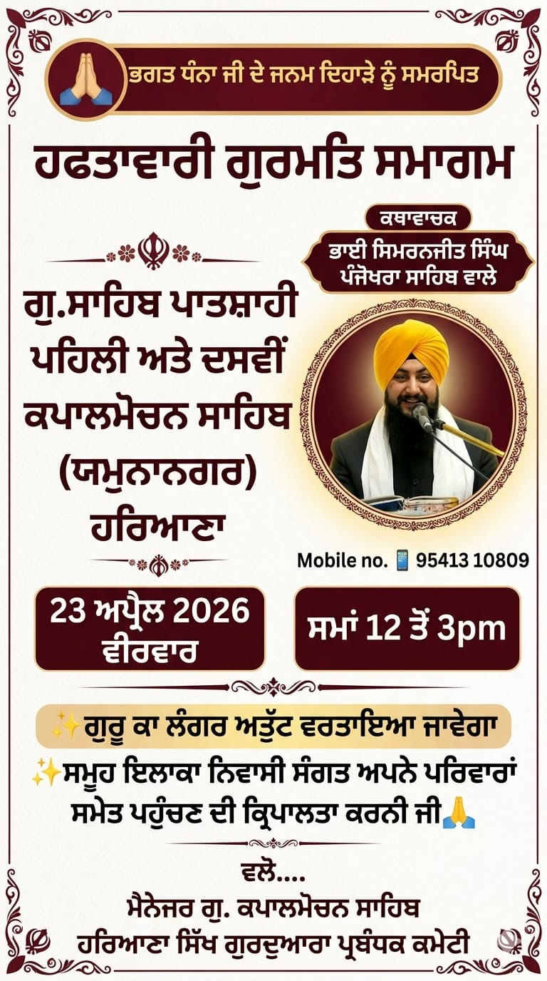 कपुरी :- आज 23 अप्रैल 2026, गुरुद्वारा पातशाही पहली और दसवीं कपालमोचन, ब्लॉक बिलासपुर जिला यमुनानगर -हरयाणा में सप्ताहिक गुरमत समागम हुआ, भारी संख्या में संगत नतमस्तक हुई व गुरु का लंगर अटूट बरताया गया !