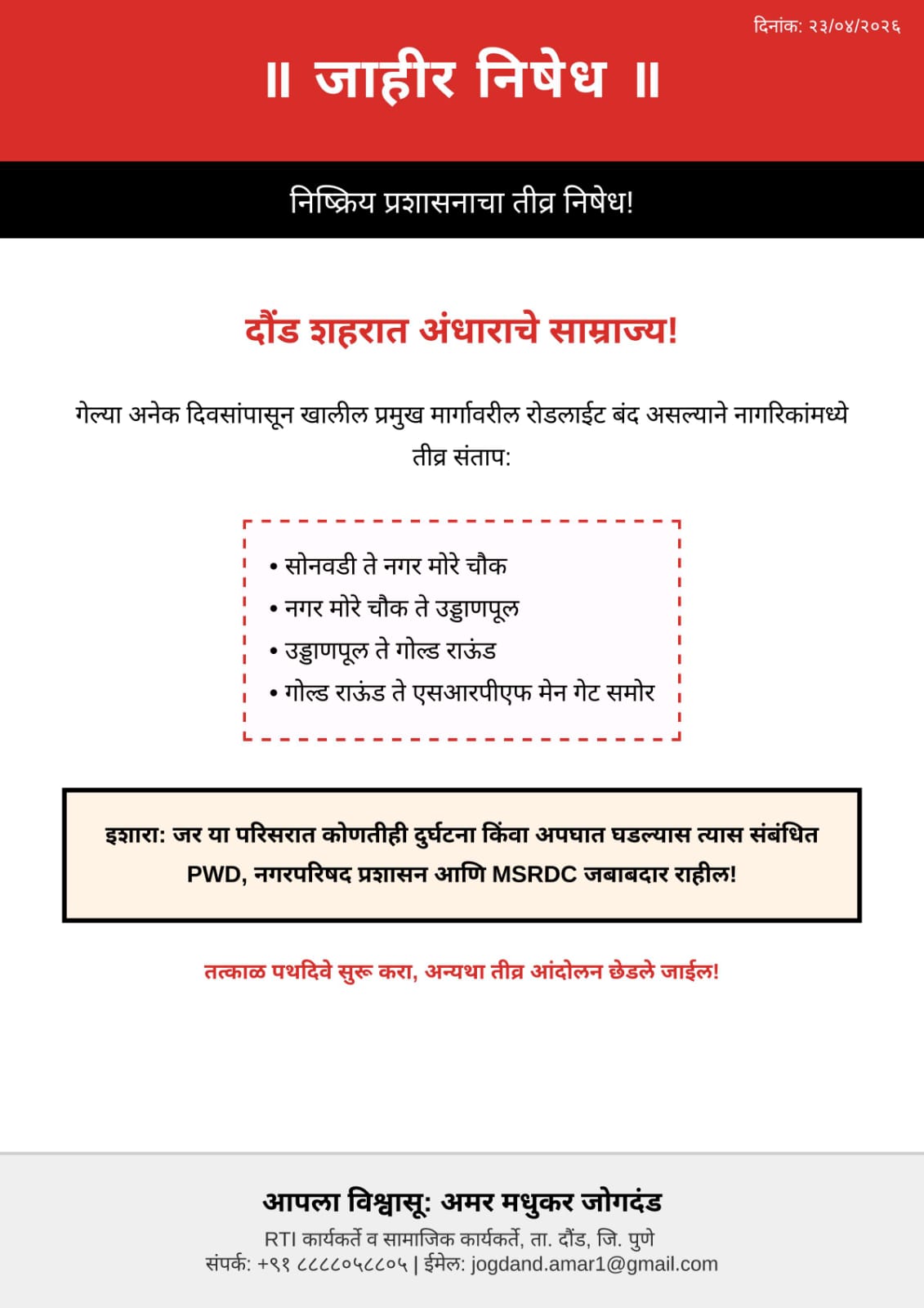 тЪая╕П рдЬрд░ рдпрд╛ рдкрд░рд┐рд╕рд░рд╛рдд рдХреЛрдгрддреАрд╣реА рджреБрд░реНрдШрдЯрдирд╛, рдЕрдкрдШрд╛рдд рдХрд┐рдВрд╡рд╛ рдЕрдиреБрдЪрд┐рдд рдШрдЯрдирд╛ рдШрдбрд▓реА, рддрд░ рддреНрдпрд╛рд╕ рд╕рдВрдмрдВрдзрд┐рдд PWD рдЕрдзрд┐рдХрд╛рд░реА, рдирдЧрд░рдкрд░рд┐рд╖рдж рдкреНрд░рд╢рд╛рд╕рди рд╡ рдорд╣рд╛рд░рд╛рд╖реНрдЯреНрд░ рд░рд╛рдЬреНрдп рд░рд╕реНрддреЗ рд╡рд┐рдХрд╛рд╕ рдорд╣рд╛рдордВрдбрд│ рдЬрдмрд╛рдмрджрд╛рд░ рдзрд░рд╛рд╡реЗ, рдЕрд╢реА рдирд╛рдЧрд░рд┐рдХрд╛рдВрдЪреА рдорд╛рдЧрдгреА рдЖрд╣реЗ.
