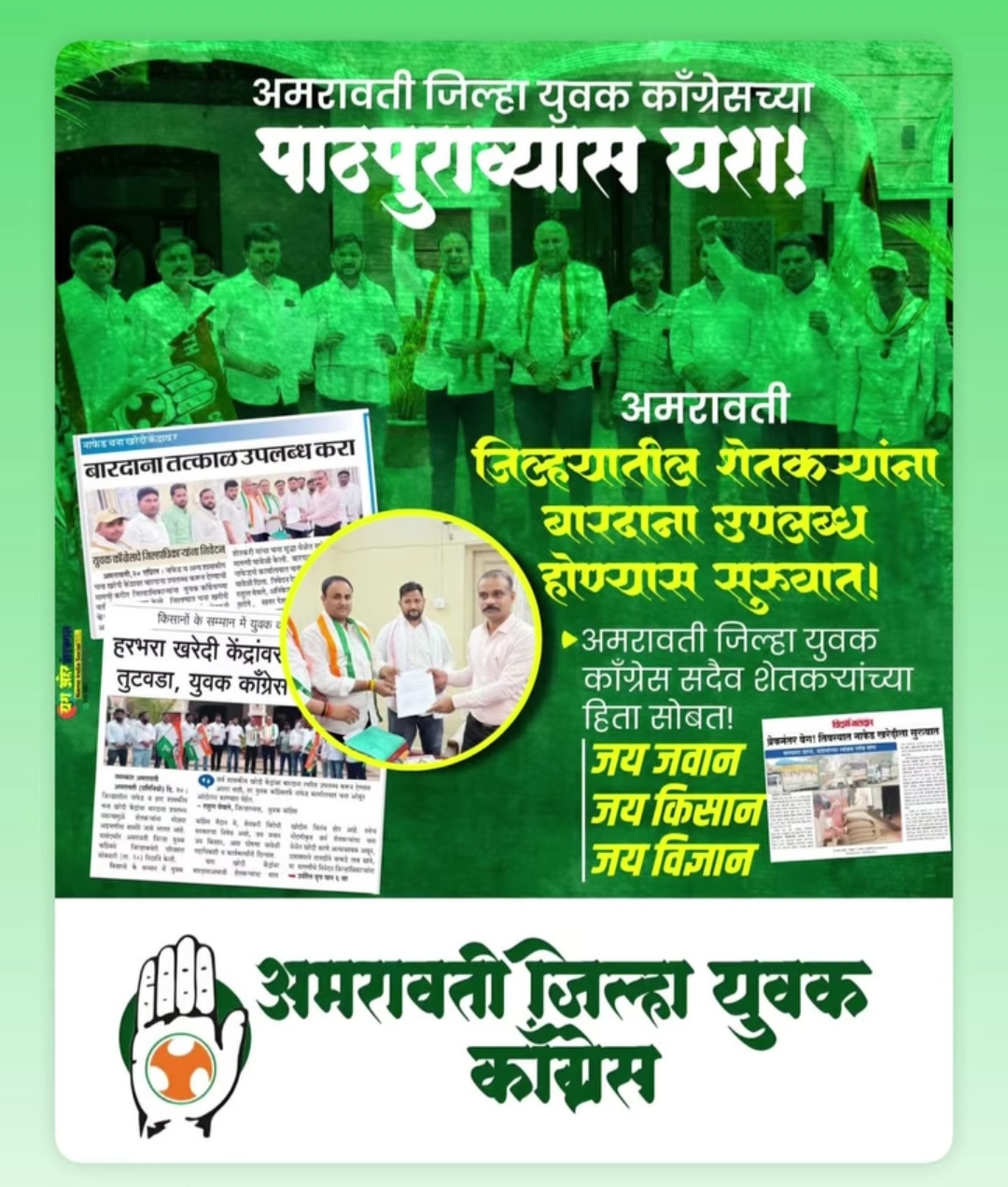 अमरावती में जिला युवा कांग्रेस के प्रयासों को मिली बड़ी सफलता, किसानों के लिए 'बारदाना' हुआ उपलब्ध........!!!