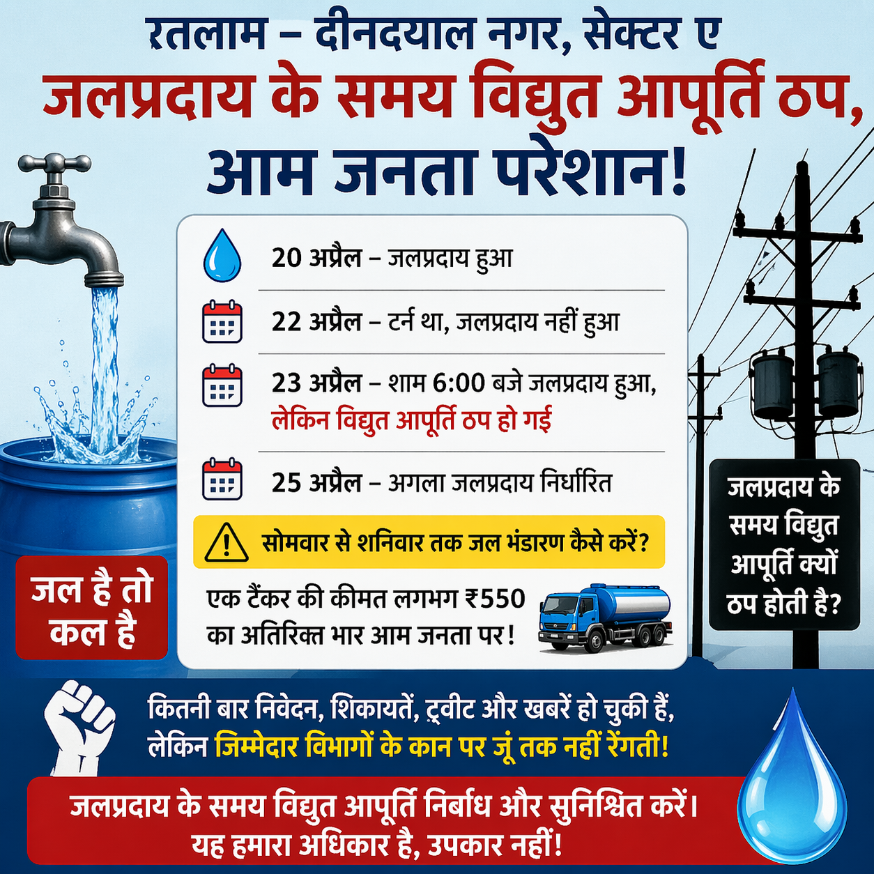 रतलाम के दीनदयाल नगर, सेक्टर ‘ए’ की यह कथा केवल एक मोहल्ले की समस्या नहीं, बल्कि व्यवस्थागत उदासीनता का जीवंत दस्तावेज बन चुकी है। दिनांक 20 अप्रैल को जलप्रदाय हुआ, जिसका अगला क्रम 22 अप्रैल को होना था, परंतु उस दिन जल नहीं पहुँचा। प्रतीक्षा की घड़ियाँ बढ़ीं और 23 अप्रैल को जलप्रदाय का क्रम आया, किंतु नियति की विडंबना देखिए—संध्या 6 बजे, जब जलप्रवाह का समय निर्धारित था, उसी क्षण विद्युत आपूर्ति ठप हो गई। परिणामतः न जल का संचय हो सका, न ही सामान्य जीवन की धारा सुचारु रह पाई।