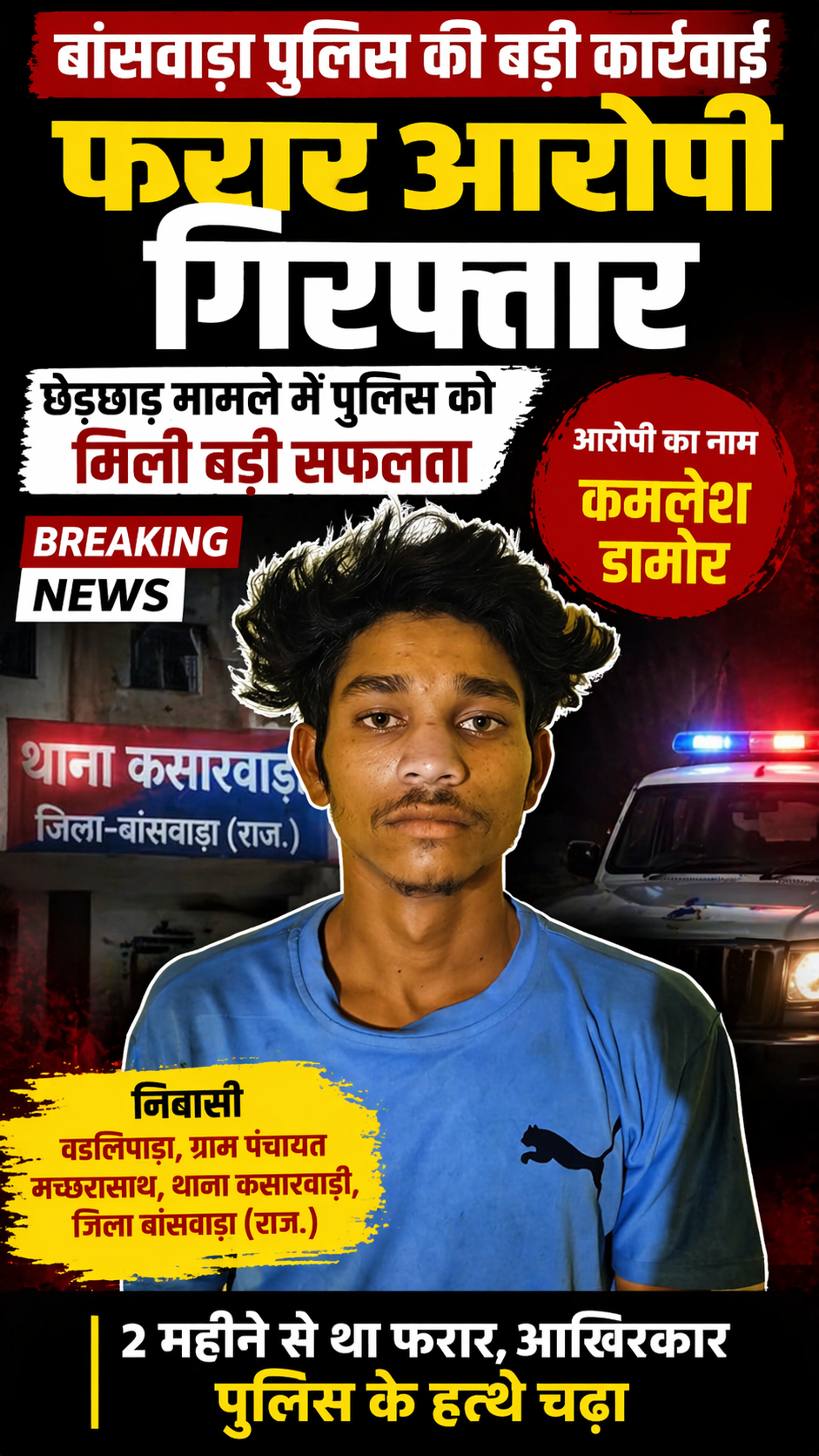 पुलिस के अनुसार आरोपी कमलेश डामोर, पिता कड़वा डामोर, निवासी वडलिपाड़ा, ग्राम पंचायत मच्छरासाथ, थाना कसारवाड़ी, जिला बांसवाड़ा का रहने वाला है।