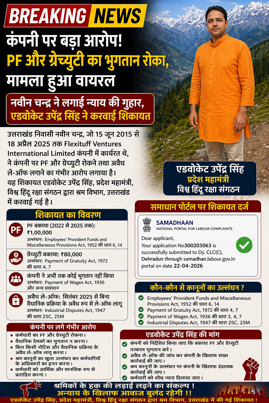 इस पूरे मामले को एडवोकेट उपेंद्र सिंह (प्रदेश महामंत्री, विश्व हिंदू रक्षा संगठन) द्वारा श्रम विभाग, उत्तराखंड में उठाया गया है।