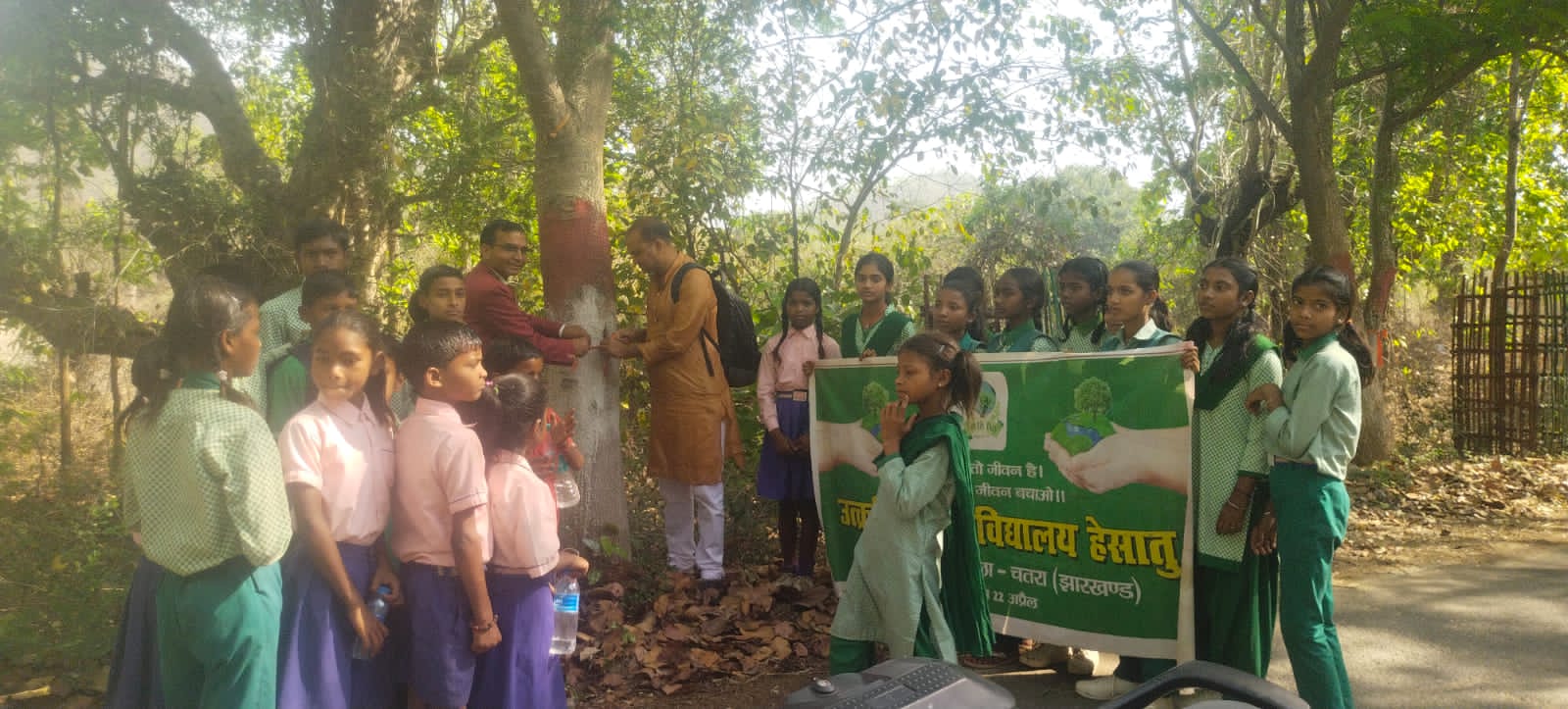टंडवा:उत्क्रमित उच्च विद्यालय हेसातु प्रखण्ड- टण्डवा में पृथ्वी दिवस का आयोजन किया गया। इस मौके पर शिक्षक बिनेश्वर कुमार के नेतृत्व में पृथ्वी और इसके पर्यावरण संरक्षण के लिए विद्यालय के छात्र -छात्राओं ने जन-जागरूकता रैली निकाला। इस दौरान बच्चों ने जंगल है तो जीवन है -जंगल बचाओ जीवन बचाओ, पेड़ लगाओ- पेड़ बचाओ, हम सबने ठाना है - पृथ्वी दिवस को सफल बनाना है, वृक्षारोपण कार्य महान - एक पेड़ दस पुत्र समान आदि नारे गुंजे। यह रैली हेसातु मिश्रौल के डाडी जंगल पहुंचा। जहां कार्यक्रम के मुख्य अतिथि टंडवा प्रखंड के उपप्रमुख जितेन्द्र कुमार सिंह उर्फ पप्पू सिंह , ग्रामीण चिकित्सक सत्येन्द्र कुमार तथा खद्दैया निवासी उत्तम कुमार सिन्हा ने पेड़ों में रक्षा सूत्र बांधकर रक्षाबंधन कार्यक्रम का शुभारंभ किया।उपस्थित सभी छात्र -छात्राओं ने पेड़ों पर रक्षा सूत्र बांधकर जंगल को बचाने का संकल्प लिया। मुख्य अतिथि ने अपने संबोधन में कहा कि हमें वनों के संरक्षण के लिए जागरूक होना होगा तभी जीवन बचेगा। उन्होंने सभी जन सामान्य से जंगल और पर्यावरण को बचाने में अपनी भुमिका सुनिश्चित करने करने का आवाह्न किया। उन्होंने छोटे छोटे बच्चों के वन संरक्षण के प्रति समर्पण की सराहना करते हुए कहा कि ये बच्चे प्रतिकूल मौसम के बावजूद जंगल को बचाने के लिए 5 किमी की पदयात्रा कर रक्षा बंधन का कार्यक्रम कर रहे हैं। कार्यक्रम को सफल बनाने के लिए विद्यालय के शिक्षक अवधेश राम, पप्पू राम, दीपक कुमार सिंह, हीरालाल सिंह, महेश राम, बिकेश कुमार सिंह के अतिरिक्त विद्यालय के प्रभारी प्रधानाध्यापक दासो राणा समेत अन्य शामिल थे।। फोटो जागरुकता रैली