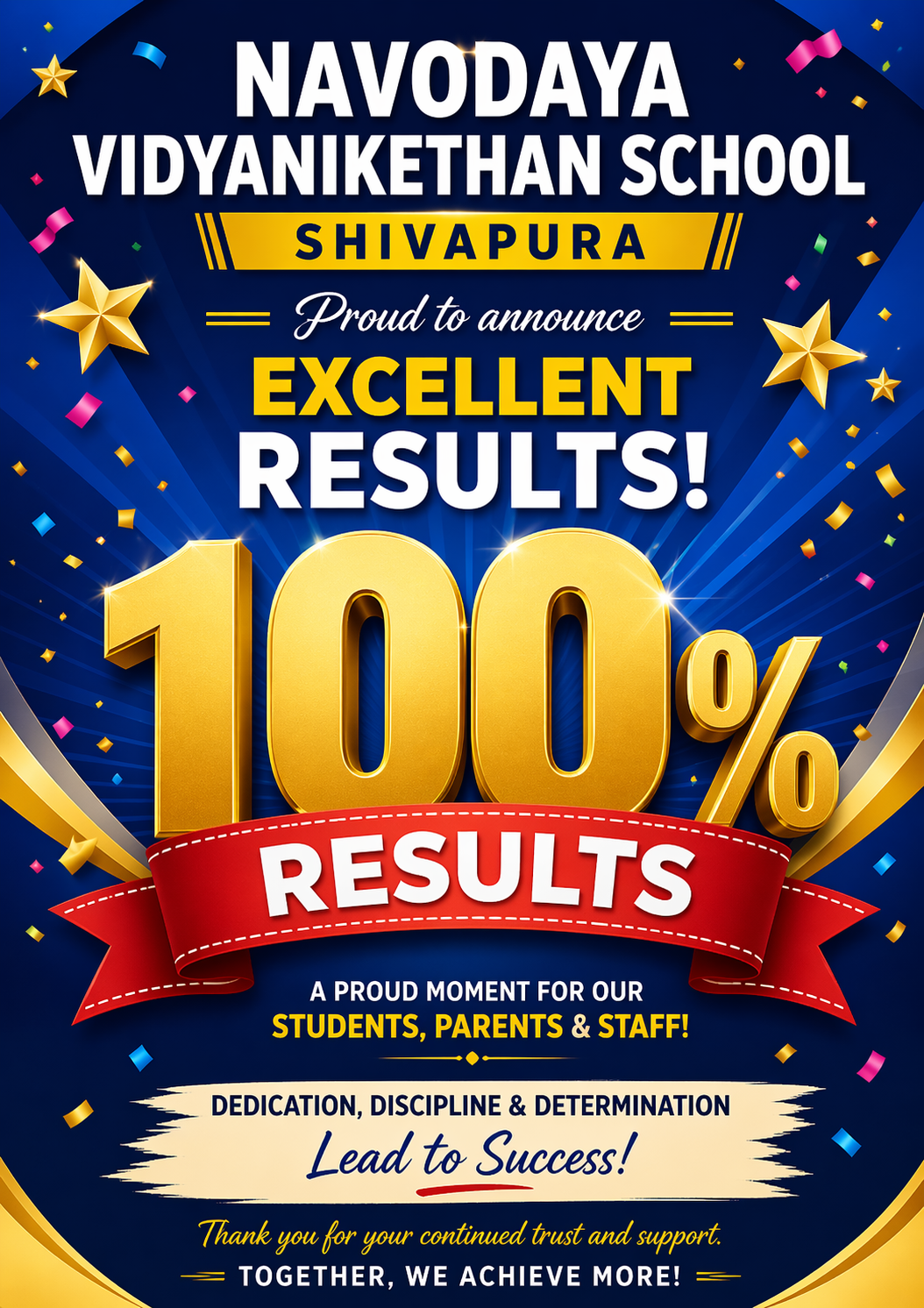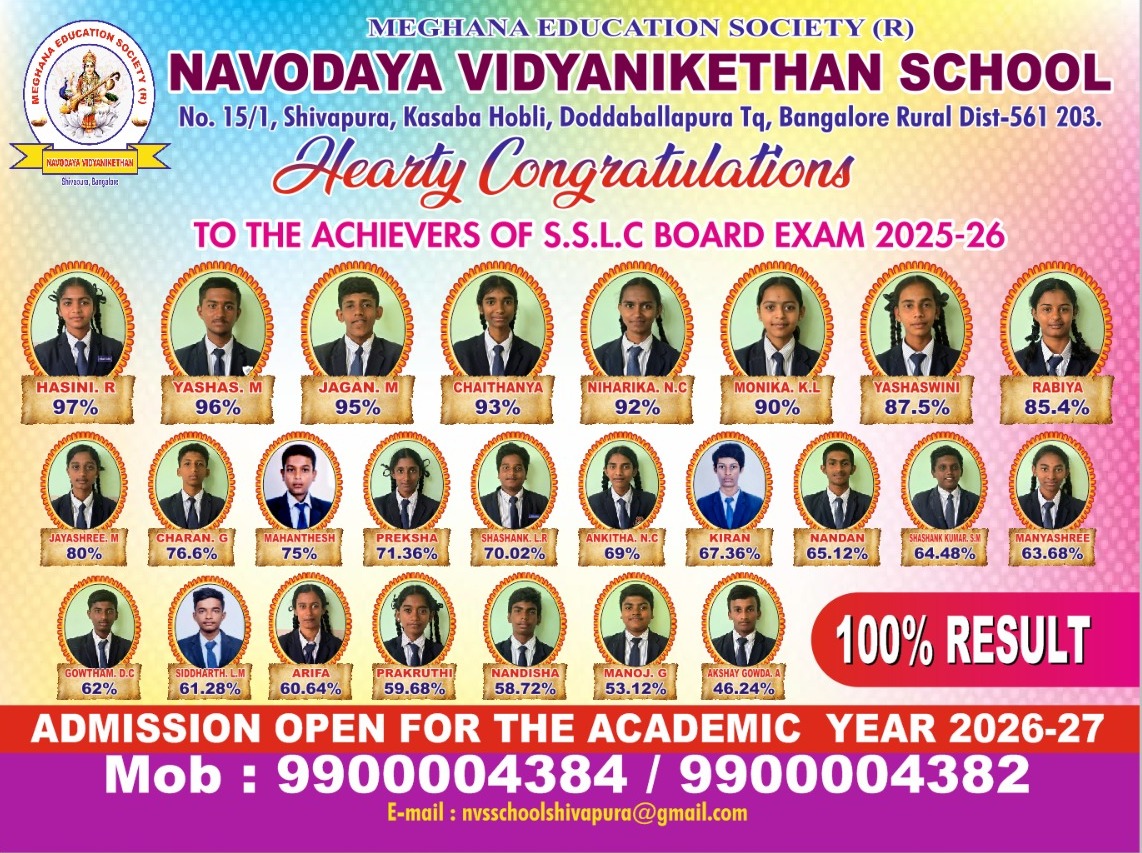 ಶಿವಾಪುರ: ದೋಡ್ಡಬಳ್ಳಾಪುರ ತಾಲ್ಲೂಕಿನ ಶಿವಾಪುರದಲ್ಲಿರುವ ನವೋದಯ ವಿದ್ಯಾನಿಕೇತನ ಶಾಲೆಯು 2025-26ನೇ ಸಾಲಿನ ಎಸ್‌.ಎಸ್‌.ಎಲ್‌.ಸಿ. ಪರೀಕ್ಷೆಯಲ್ಲಿ ಶೇ.100 ಫಲಿತಾಂಶ ಸಾಧಿಸಿ ಗಮನ ಸೆಳೆದಿದೆ.