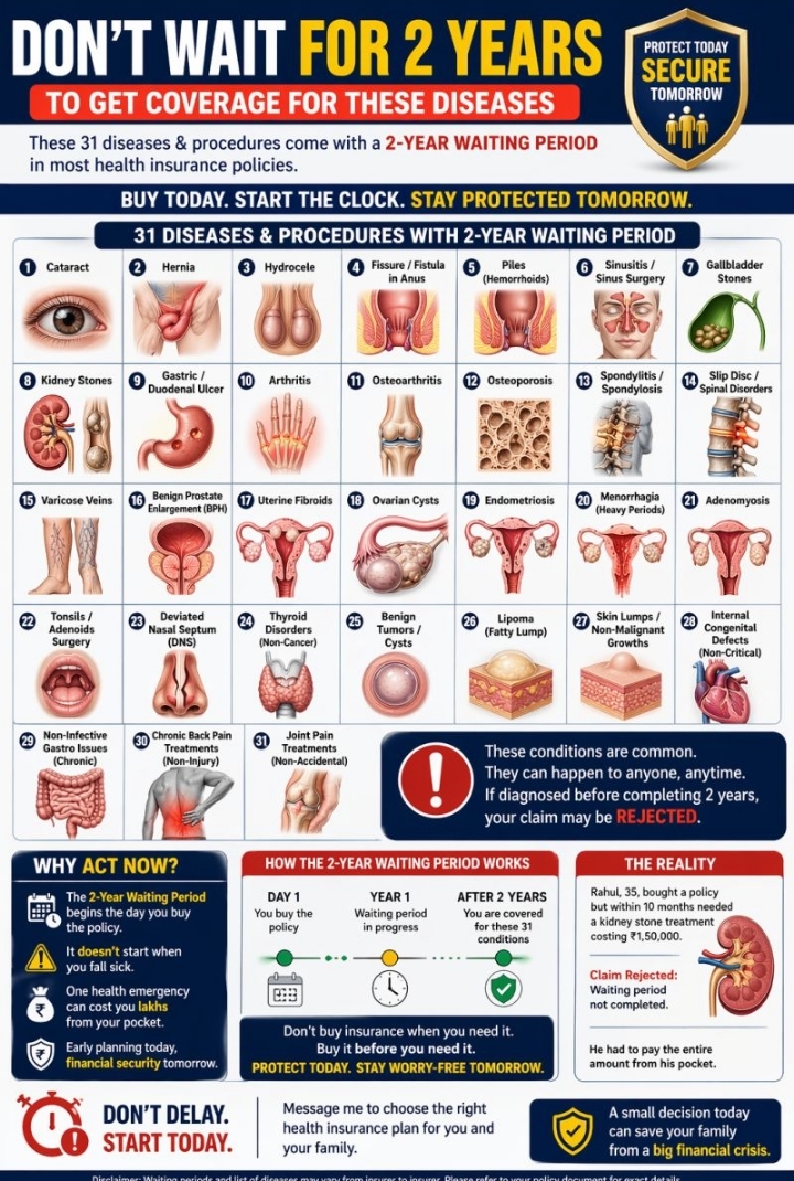 👉 अधिकांश हेल्थ इंश्योरेंस पॉलिसियों में 30+ बीमारियों पर 2 साल का वेटिंग पीरियड लागू होता है