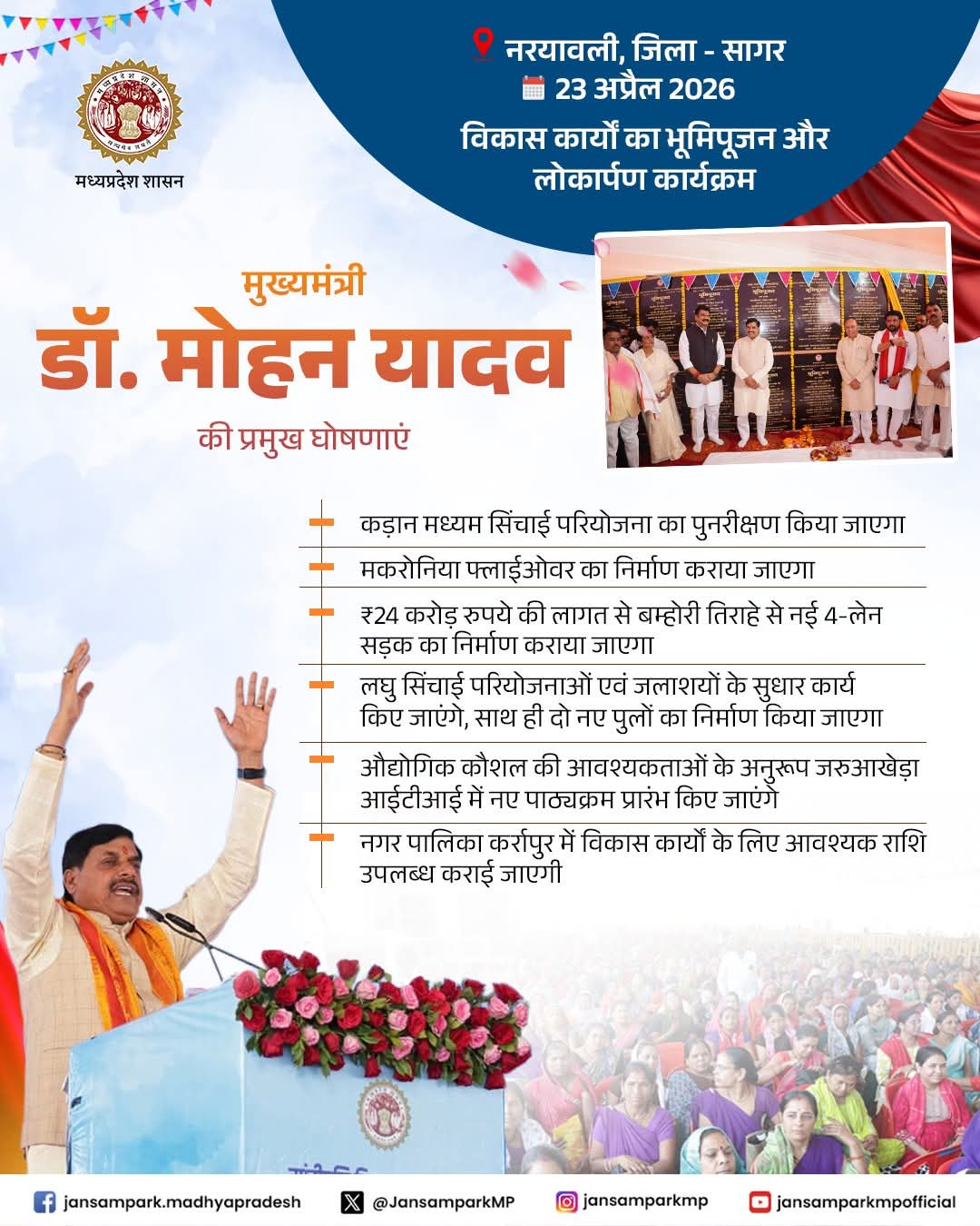 मुख्यमंत्री डॉ मोहन यादव द्वारा सागर जिले के नरयावली में आयोजित विकास कार्यों के भूमिपूजन व लोकार्पण कार्यक्रम में सहभागिता