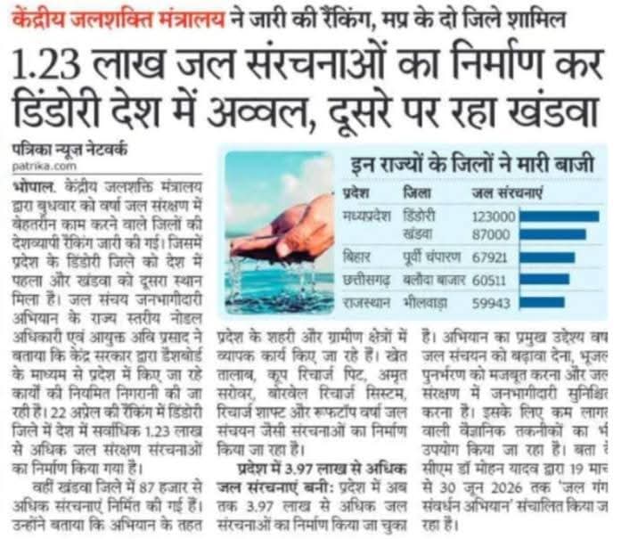 जल शक्ति मंत्रालय द्वारा जारी रैंकिंग में मध्यप्रदेश का डिंडोरी जिला देश में पहले और खंडवा जिला दूसरे स्थान पर