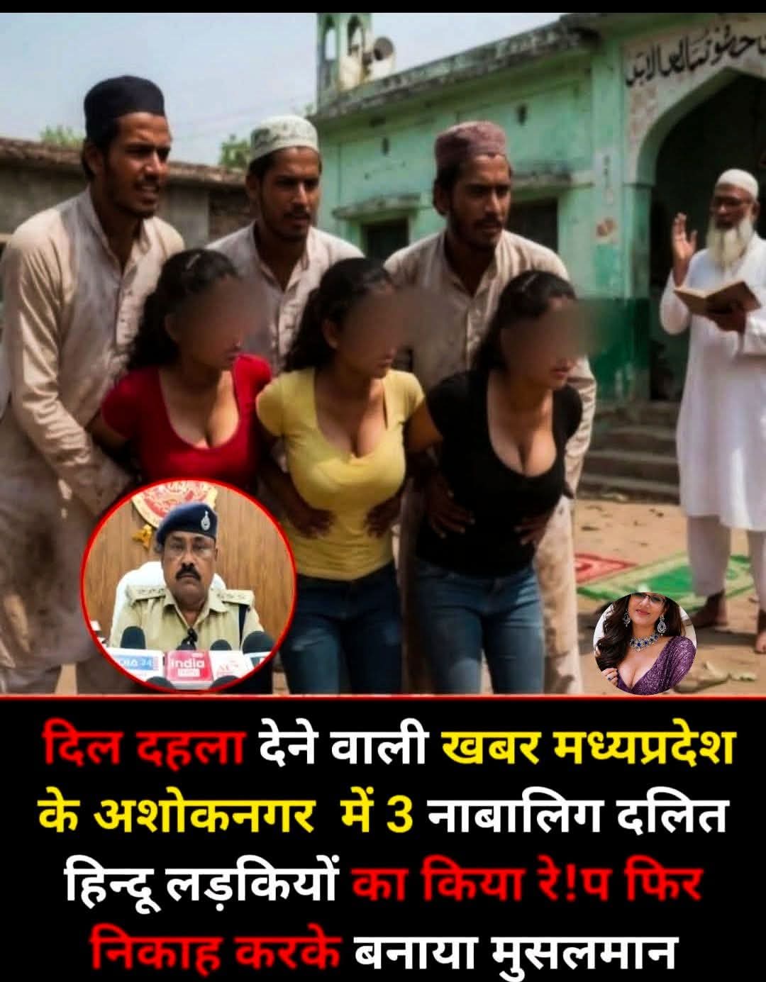 भाइयों-बहनों, सुनिए एक ऐसी खबर जो खू**न खौ**ला देगी। अशोकनगर के पिपरई इलाके में 3 नाबालिग दलित हिंदू लड़कियां - एक 17 साल की और दो 15 साल की - भोपाल के 3 मुस्लिम लड़कों आहत शेख, अल्तमश खान और आह्यान खान के चंगुल में फंस गईं। इन हमदर्दों ने लड़कियों को बहला-फुसला कर भोपाल ले जाकर पहले रेप किया, फिर जबरन निकाह रचाकर मुसलमान बना दिया। बुर्का पहनाकर घर लौटी लड़कियां तो मां-बाप के होश उड़ गए!