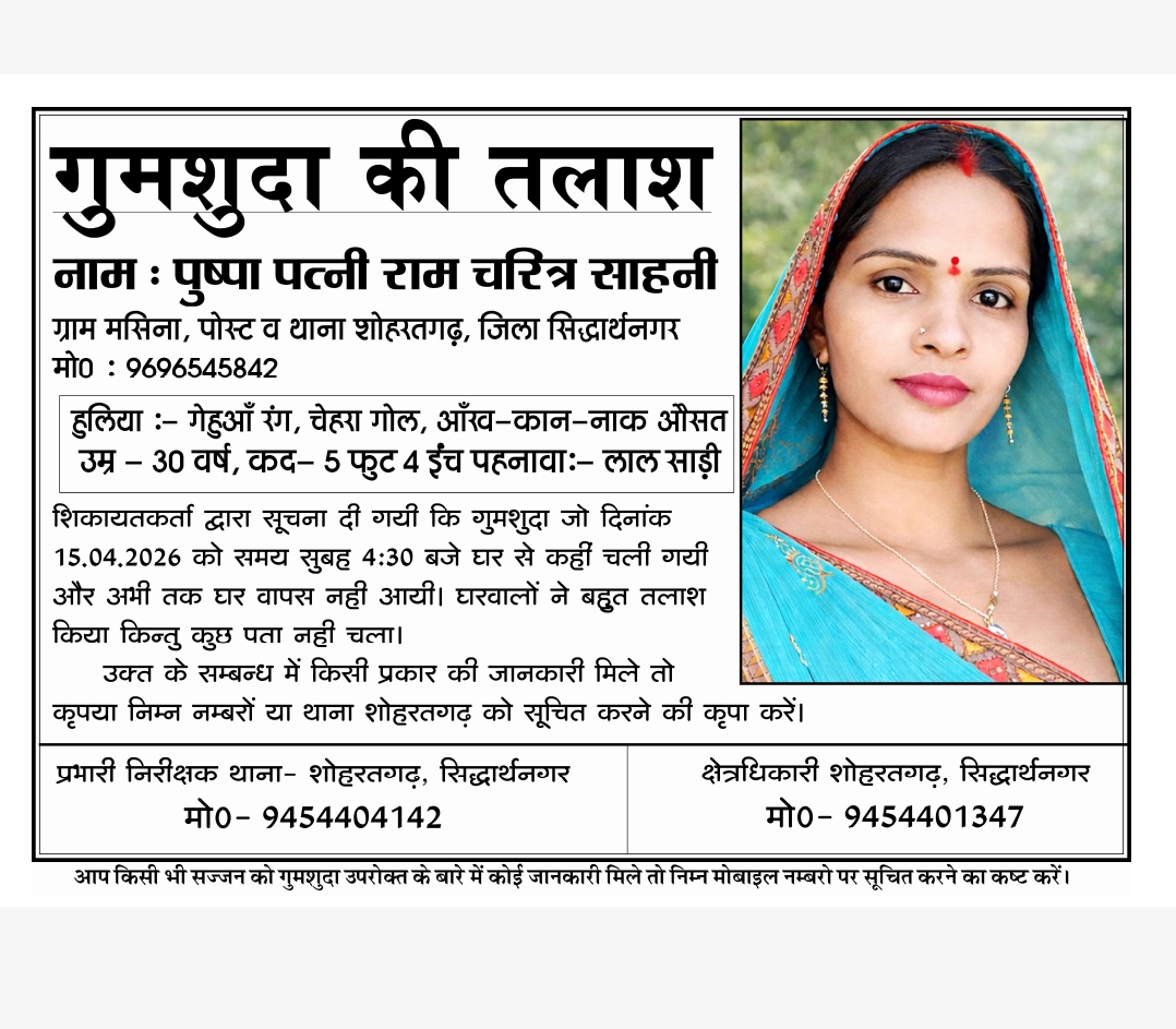 рд╕рд┐рджреНрдзрд╛рд░реНрдердирдЧрд░ рдЬрд┐рд▓реЗ рдХреЗ рд╢реЛрд╣рд░рддрдЧрдврд╝ рдерд╛рдирд╛ рдХреНрд╖реЗрддреНрд░ рдХреЗ рдЧреНрд░рд╛рдо рдорд╕рд┐рдирд╛ рд╕реЗ рдПрдХ рдорд╣рд┐рд▓рд╛ рдХреЗ рдЧреБрдорд╢реБрджрд╛ рд╣реЛрдиреЗ рдХрд╛ рдорд╛рдорд▓рд╛ рд╕рд╛рдордиреЗ рдЖрдпрд╛ рд╣реИред рдЧреБрдорд╢реБрджрд╛ рдорд╣рд┐рд▓рд╛ рдХрд╛ рдирд╛рдо рдкреБрд╖реНрдкрд╛ рд╕рд╛рд╣рдиреА, рдкрддреНрдиреА рд░рд╛рдо рдЪрд░рд┐рддреНрд░ рд╕рд╛рд╣рдиреА рдмрддрд╛рдпрд╛ рдЬрд╛ рд░рд╣рд╛ рд╣реИред
