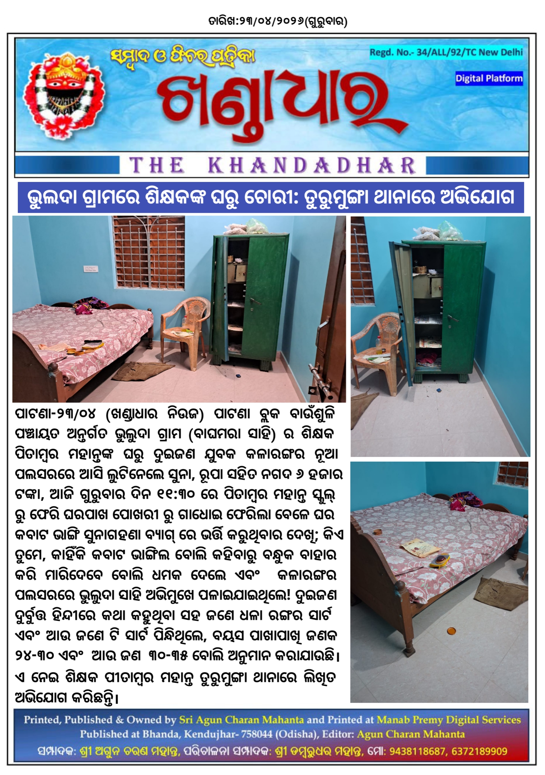 ଭୁଲଦା ଗ୍ରାମରେ ଶିକ୍ଷକଙ୍କ ଘରୁ ଚୋରୀ : ତୁରୁମୁଙ୍ଗା ଥାନାରେ ଅଭିଯୋଗ।