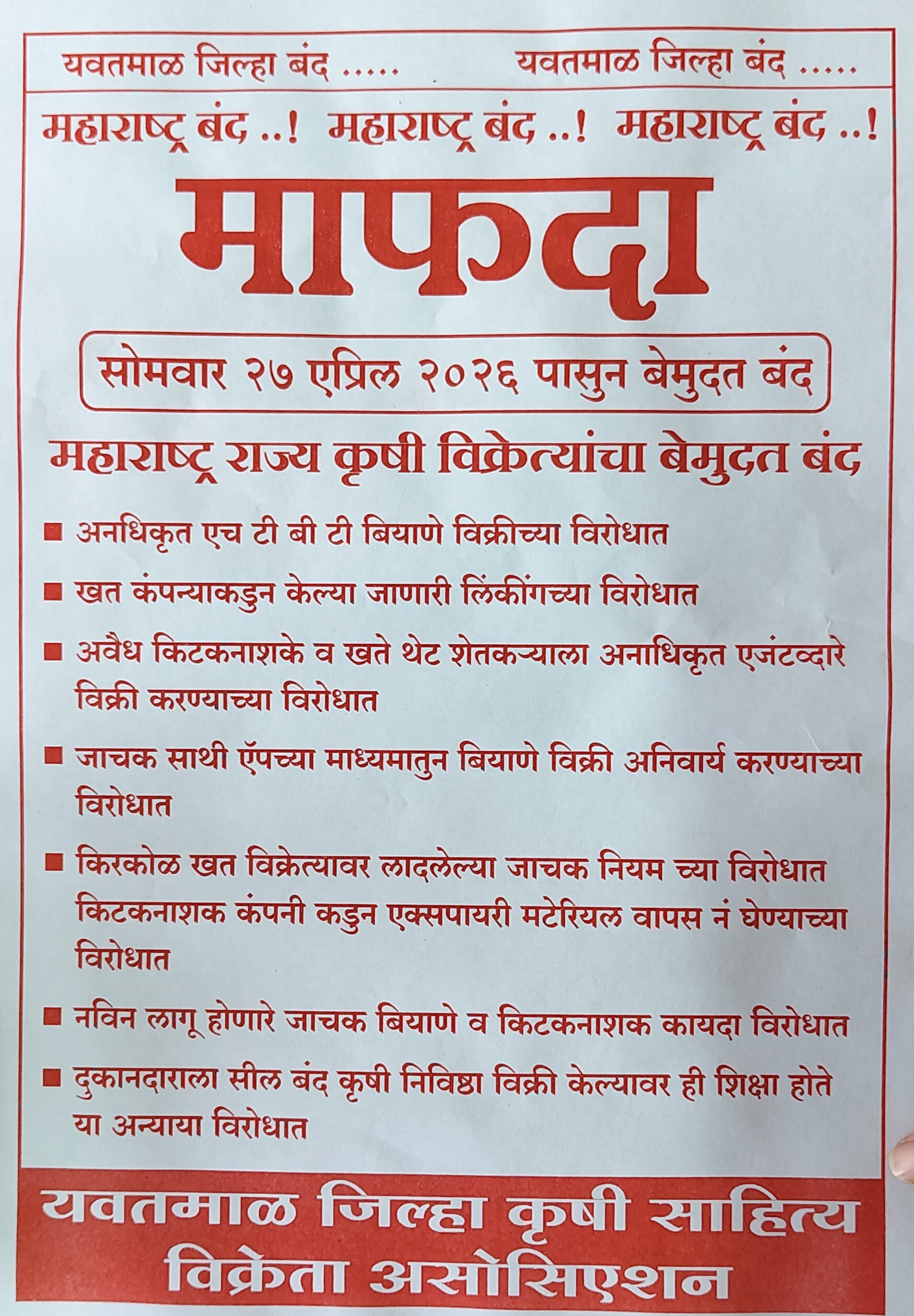 या बंदमध्ये सर्व कृषी साहित्य विक्रेते, बियाणे विक्रेते व संबंधित व्यावसायिक सहभागी होणार असून सर्वांनी सहकार्य करावे, असे आवाहन करण्यात आले आहे.