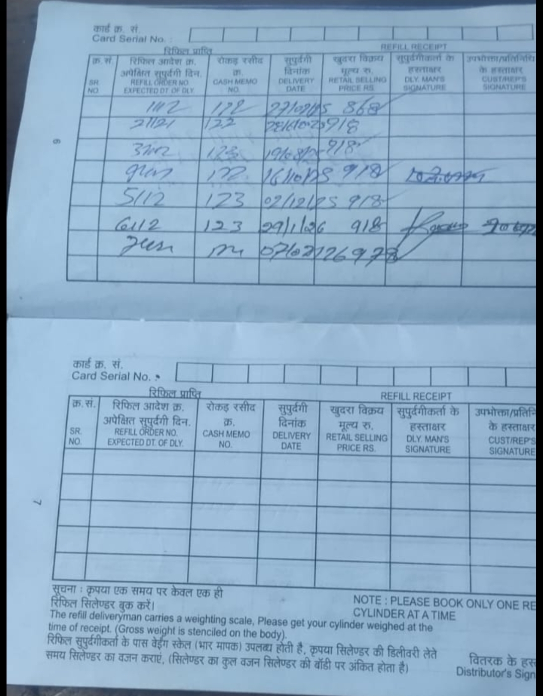 3. *रिकॉर्ड में गड़बड़ी*: ग्राहक की पासबुक में 02/08/2022 के बाद की रिफिल एंट्री अधूरी हैं, जबकि सिलेंडर खत्म हुए हफ्तों बीत चुके हैं।