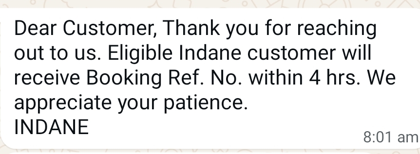 ग्राहक के पासबुक के अनुसार, वितरक द्वारा सिलेंडर की डिलीवरी के लिए 45 दिन का समय निर्धारित है। लेकिन जब ग्राहक ने बुकिंग के लिए कॉल किया तो इंडेन की तरफ से मैसेज आया: _"Dear Customer, Eligible Indane customer will receive Booking Ref. No. within 4 hrs. We appreciate your patience."_