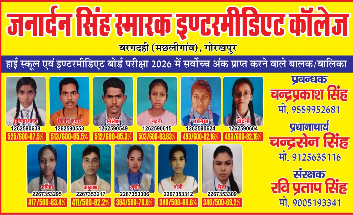जनार्दन सिंह स्मारक इंटर कॉलेज ने उत्तर प्रदेश माध्यमिक शिक्षा परिषद (यूपी बोर्ड) की वर्ष 2026 की परीक्षाओं में उत्कृष्ट प्रदर्शन किया है। सीमित संसाधनों के बावजूद, विद्यार्थियों ने कड़ी मेहनत और शिक्षकों के मार्गदर्शन से शानदार परिणाम हासिल किए, जिससे क्षेत्र में एक नई मिसाल कायम हुई।