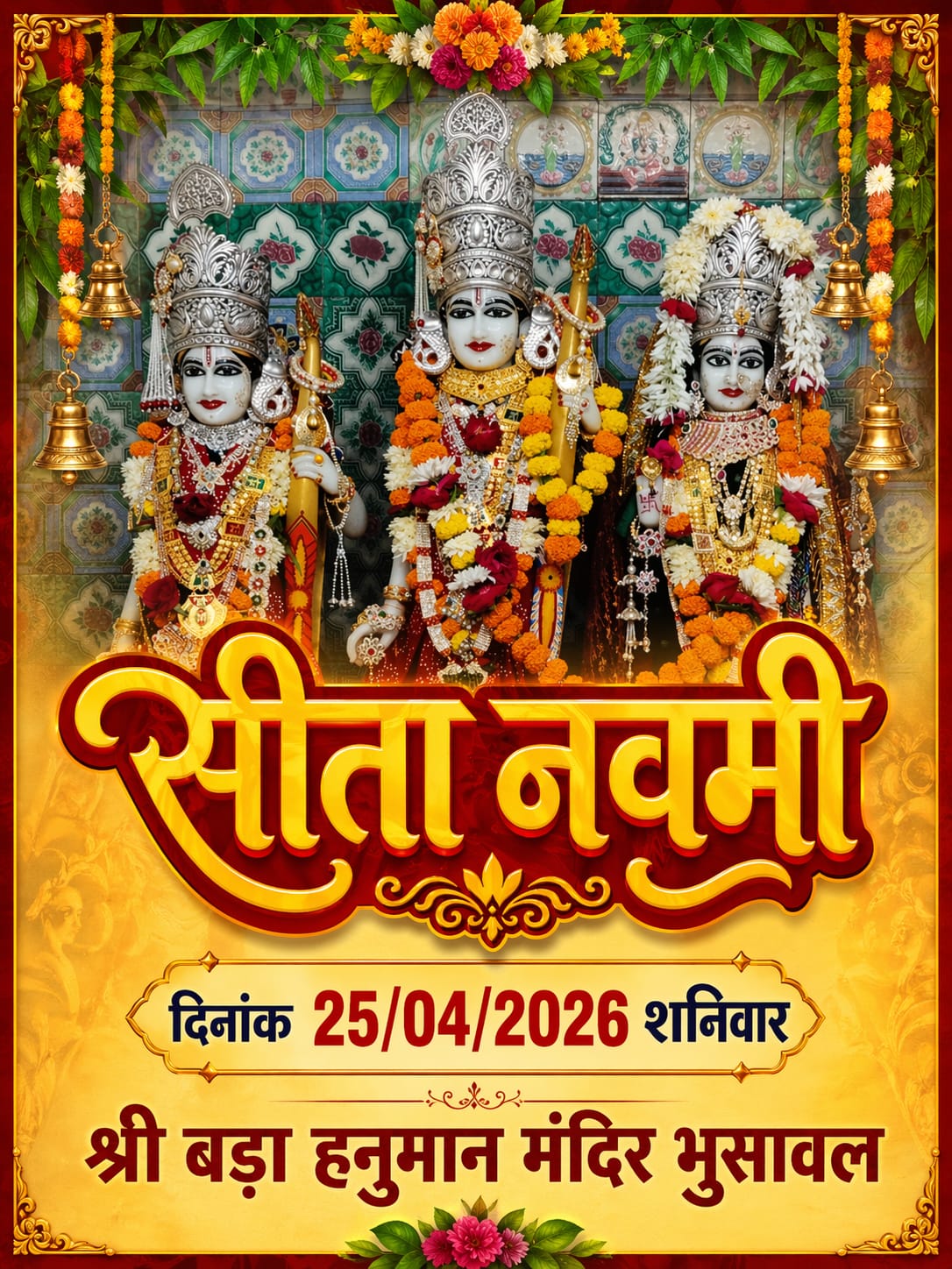 श्री बड़ा हनुमान मंदिर भुसावल में सीता नवमी का पावन पर्व श्रद्धा एवं भक्ति भाव के साथ मनाया जाएगा। इस अवसर पर मंदिर परिसर में विभिन्न धार्मिक कार्यक्रमों का आयोजन किया गया है।