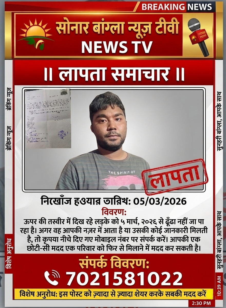लापता होने की सूचना: सबसे पहले, इस विशेष समाचार को जनहित में साझा करके एक लापता युवक को उसके परिवार से मिलाने में मदद करें ।