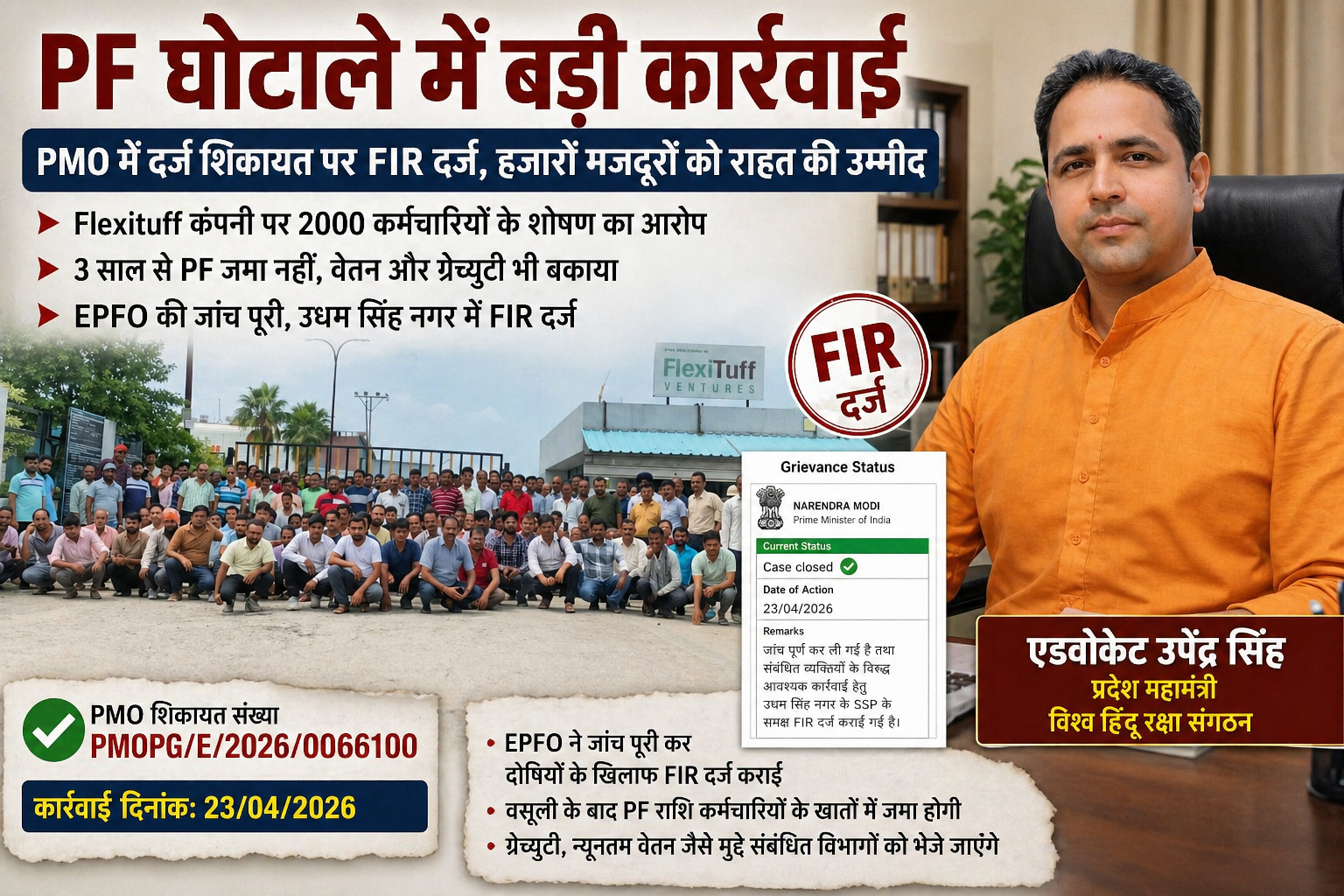 देश के प्रधानमंत्री कार्यालय (PMO) में दर्ज एक गंभीर श्रमिक शिकायत पर आखिरकार कार्रवाई शुरू हो गई है। एडवोकेट उपेंद्र सिंह, प्रदेश महामंत्री, विश्व हिंदू रक्षा संगठन द्वारा 20 अप्रैल 2026 को दर्ज कराई गई शिकायत में एक बड़ी कंपनी Flexituff Ventures International Limited पर करीब 2000 कर्मचारियों के शोषण का आरोप लगाया गया था।