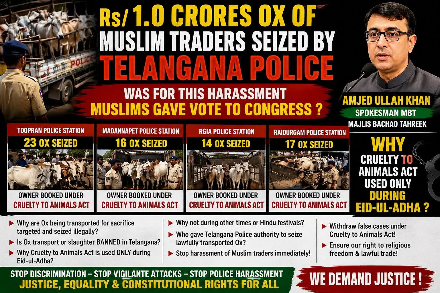 #JusticeForTraders #StopPoliceHarassment #EndSelectiveJustice #TelanganaPolice #RuleOfLaw #ConstitutionalRights #EidUlAdha #ReligiousFreedom #RightToSacrifice #FaithAndFreedom #CrueltyActMisuse #StopTargetingMuslims #EqualJusticeForAll #NoToDiscrimination #CongressAnswer #RevanthReddy #MinorityRights #SpeakUpNow #AccountabilityMatters #Hyderabad #Telangana #MBT #AmjedUllahKhan #MajlisBachaoTahreek