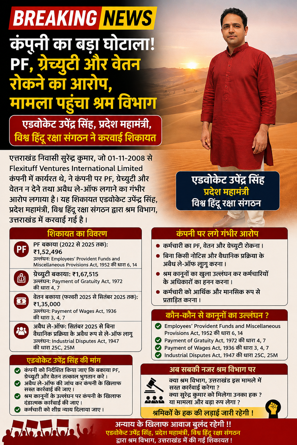 उत्तराखंड में श्रमिक अधिकारों से जुड़ा एक और गंभीर मामला सामने आया है। Flexituff Ventures International Limited कंपनी के खिलाफ कर्मचारी सुरेन्द्र कुमार ने अपने वैधानिक भुगतान न मिलने को लेकर श्रम विभाग में शिकायत दर्ज कराई है। यह शिकायत एडवोकेट उपेंद्र सिंह, प्रदेश महामंत्री, विश्व हिंदू रक्षा संगठन द्वारा करवाई गई है।