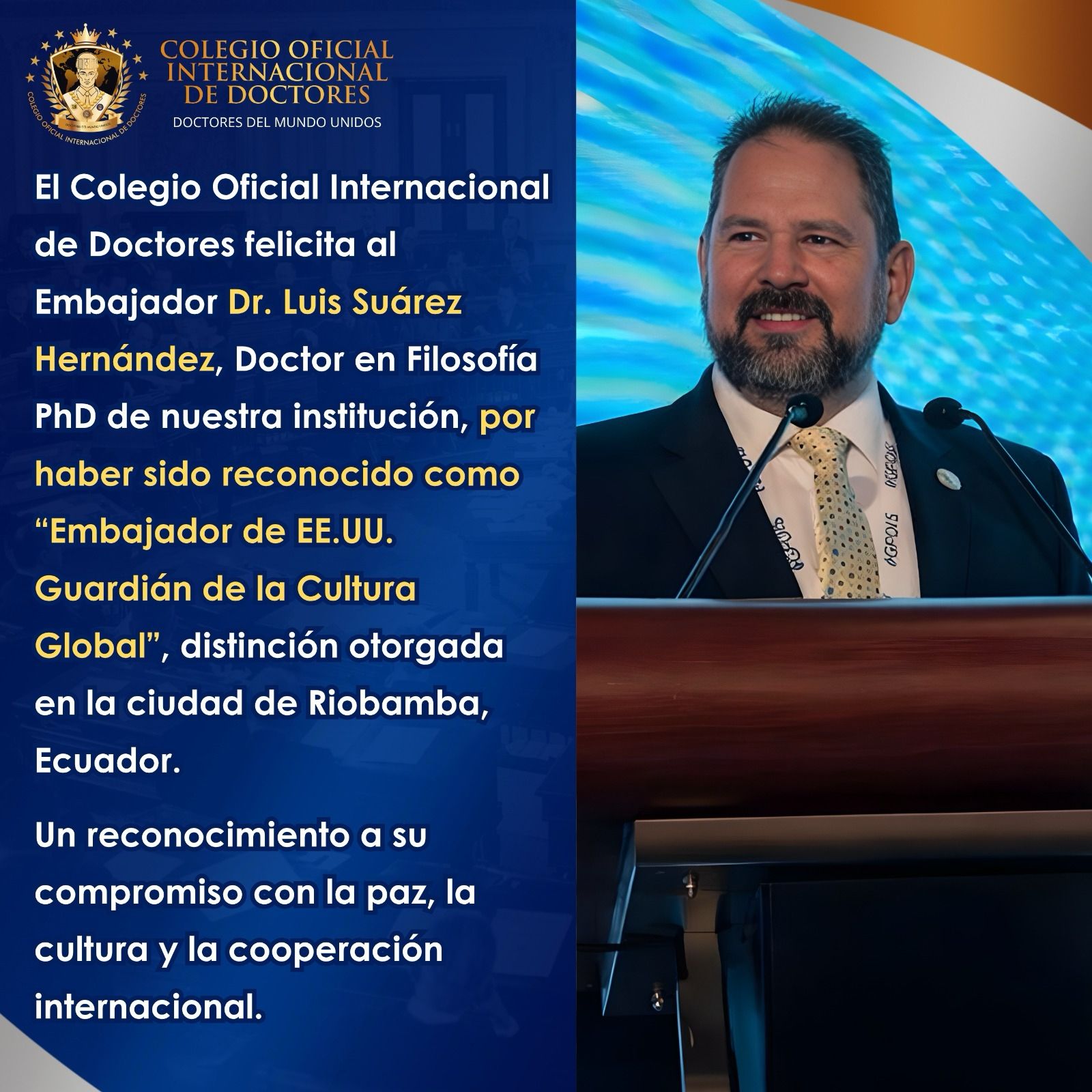 📘 The Official International College of Doctors congratulates Ambassador Dr. Luis Suárez Hernández on his distinguished recognition as “U.S. Ambassador – Guardian of Global Culture,” awarded in the city of Riobamba, Ecuador, within the framework of the “Hope for International Peace and Human Rights – Ambassadors of Justice and Legal Resolution” Committee.