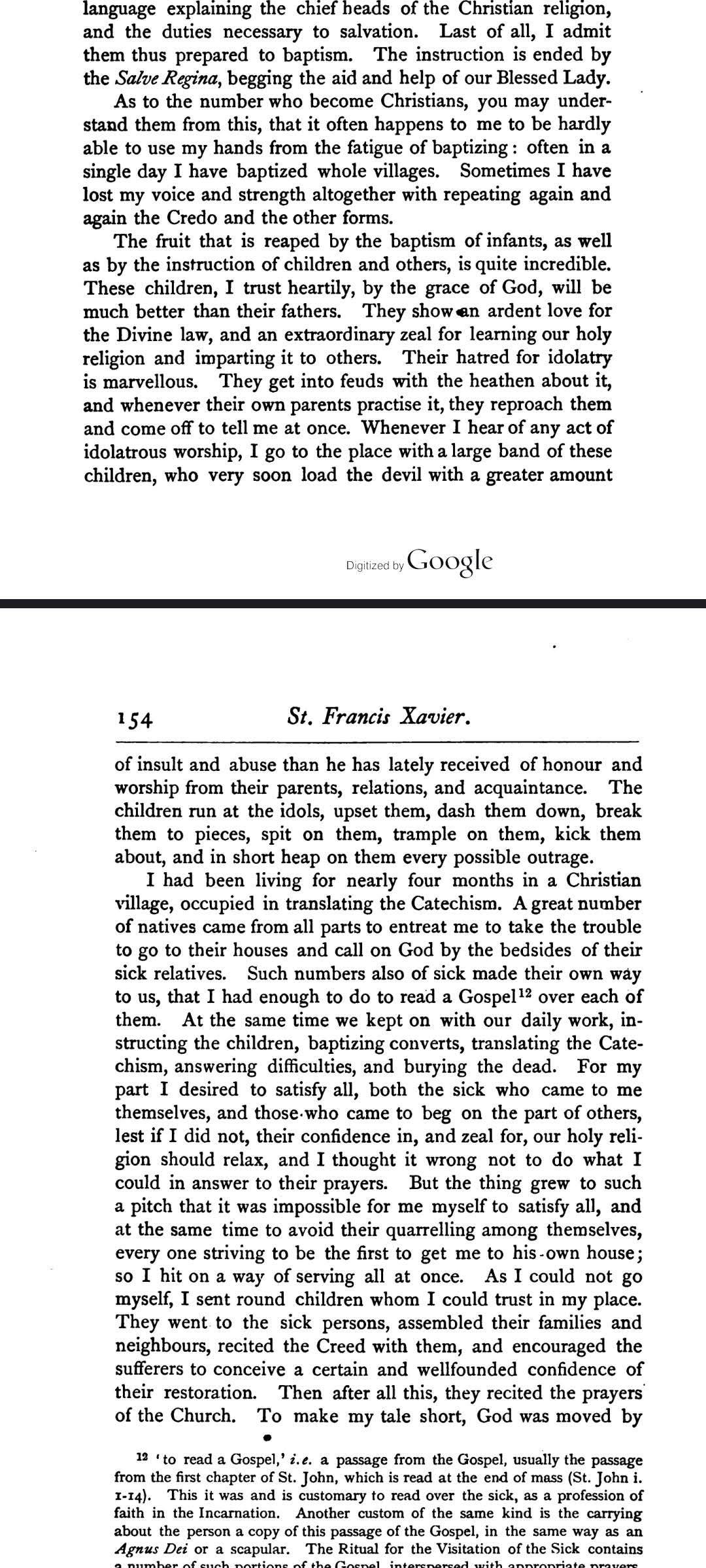 "वो बच्चे जिनको मैने ईसाई बना दिया है गैर-ईसाइयों से झगड़ा करते हैं, और जब उनके अपने माता-पिता भी मूर्तिपूजा करते है तो वे उन्हें भी डाँटते हैं और तुरंत मेरे पास आकर इसकी सूचना देते हैं। जब भी मुझे किसी प्रकार की मूर्तिपूजा की खबर मिलती है, मैं इन बच्चों के बड़े समूह के साथ वहाँ जाता हूँ, तो वो बच्चे शीघ्र ही उस ‘शैतान’ मूर्तियों पर