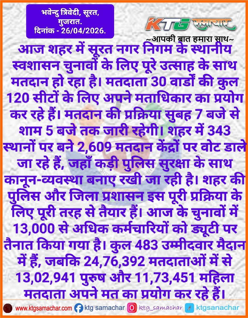 राज्यभर की जिला पंचायत और नगर निगम के साथ सूरत मे चुनाव के लिए पूरा उत्साह के साथ मतदान हो रहा है।