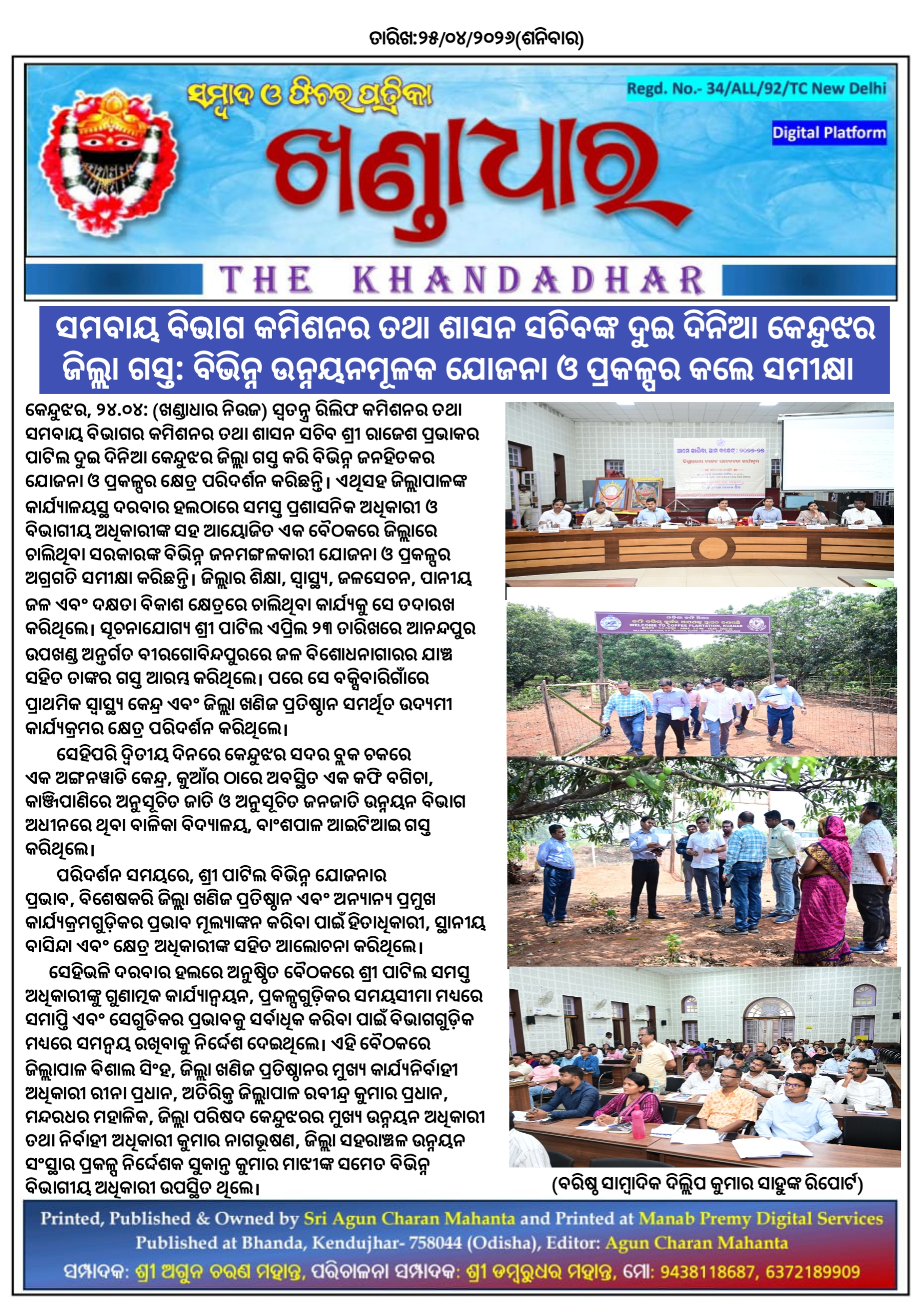 ସମବାୟ ବିଭାଗ କମିଶନର ତଥା ଶାସନ ସଚିବଙ୍କ ଦୁଇ ଦିନିଆ କେନ୍ଦୁଝର ଜିଲ୍ଲା ଗସ୍ତ: