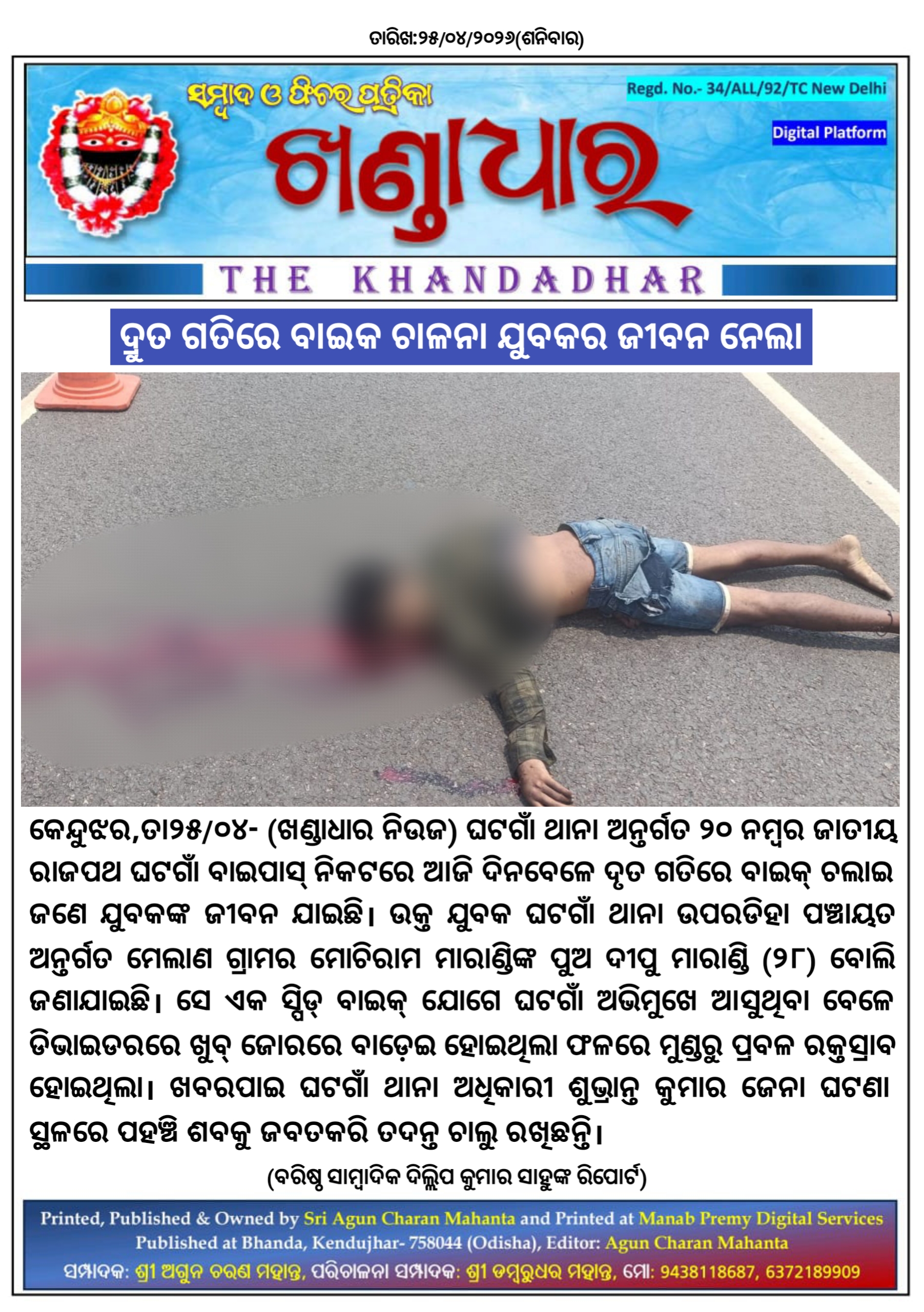 କେନ୍ଦୁଝର,ତା୨୫/୦୪- ଘଟଗାଁ ଥାନା ଅନ୍ତର୍ଗତ ୨୦ ନମ୍ବର ଜାତୀୟ ରାଜପଥ ଘଟଗାଁ ବାଇପାସ୍ ନିକଟରେ ଆଜି ଦିନବେଳେ ଦୃତ ଗତିରେ ବାଇକ୍ ଚଲାଇ ଜଣେ ଯୁବକଙ୍କ ଜୀବନ ଯାଇଛି। ଉକ୍ତ ଯୁବକ ଘଟଗାଁ ଥାନା ଉପରଡିହା ପଞ୍ଚାୟତ ଅନ୍ତର୍ଗତ ମେଲାଣ ଗ୍ରାମର ମୋଚିରାମ ମାରାଣ୍ଡିଙ୍କ ପୁଅ ଦୀପୁ ମାରାଣ୍ଡି (୨୮) ବୋଲି ଜଣାଯାଇଛି। ସେ ଏକ ସ୍ପିଡ୍ ବାଇକ୍ ଯୋଗେ ଘଟଗାଁ ଅଭିମୁଖେ ଆସୁଥିବା ବେଳେ ଡିଭାଇଡରରେ ଖୁବ୍ ଜୋରରେ ବାଡ଼େଇ ହୋଇଥିଲା ଫଳରେ ମୁଣ୍ଡରୁ ପ୍ରବଳ ରକ୍ତସ୍ରାବ ହୋଇଥିଲା। ଖବରପାଇ ଘଟଗାଁ ଥାନା ଅଧିକାରୀ ଶୁଭ୍ରାନ୍ତ କୁମାର ଜେନା ଘଟଣା ସ୍ଥଳରେ ପହଞ୍ଚି ଶବକୁ ଜବତକରି ତଦନ୍ତ ଚାଲୁ ରଖିଛନ୍ତି।